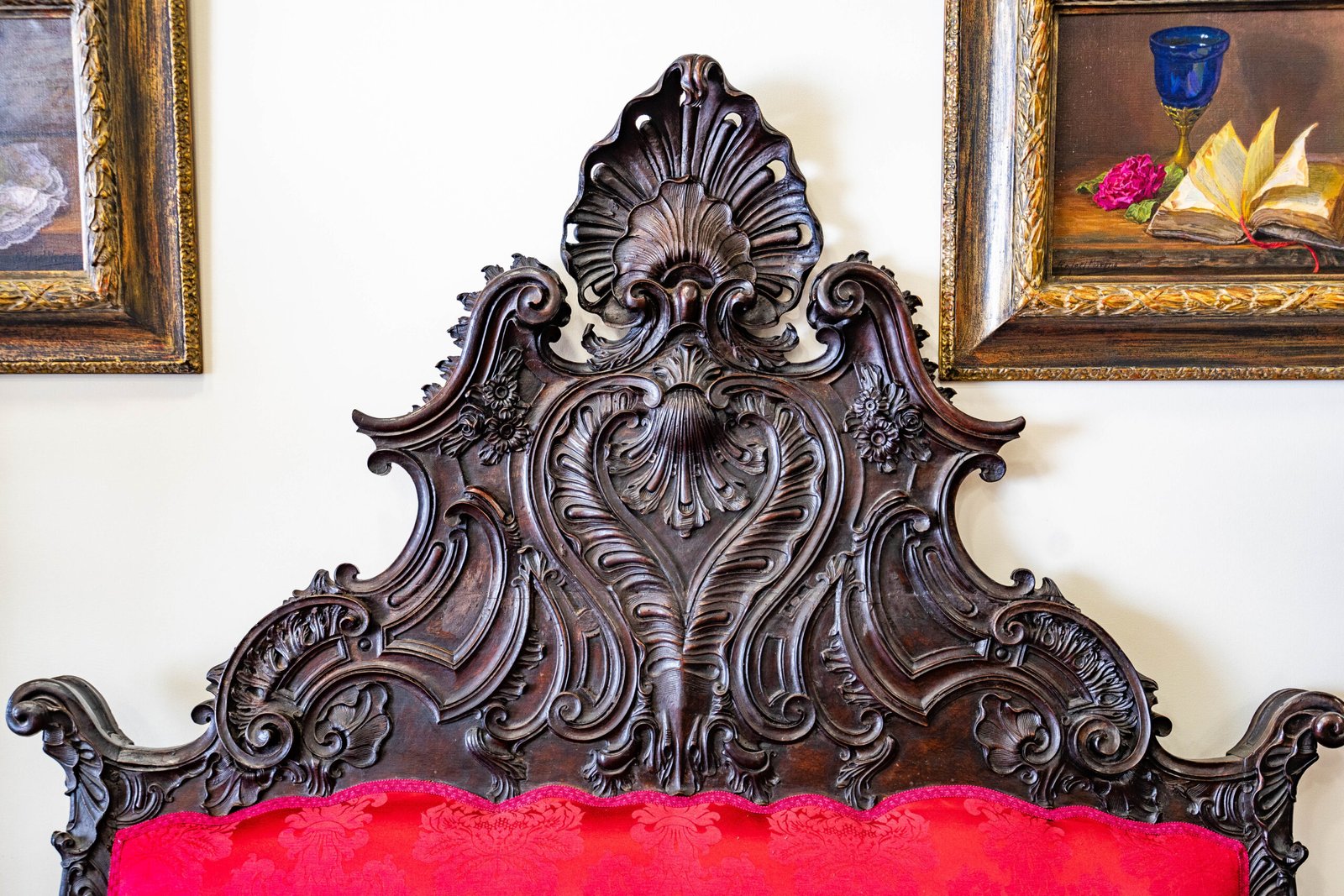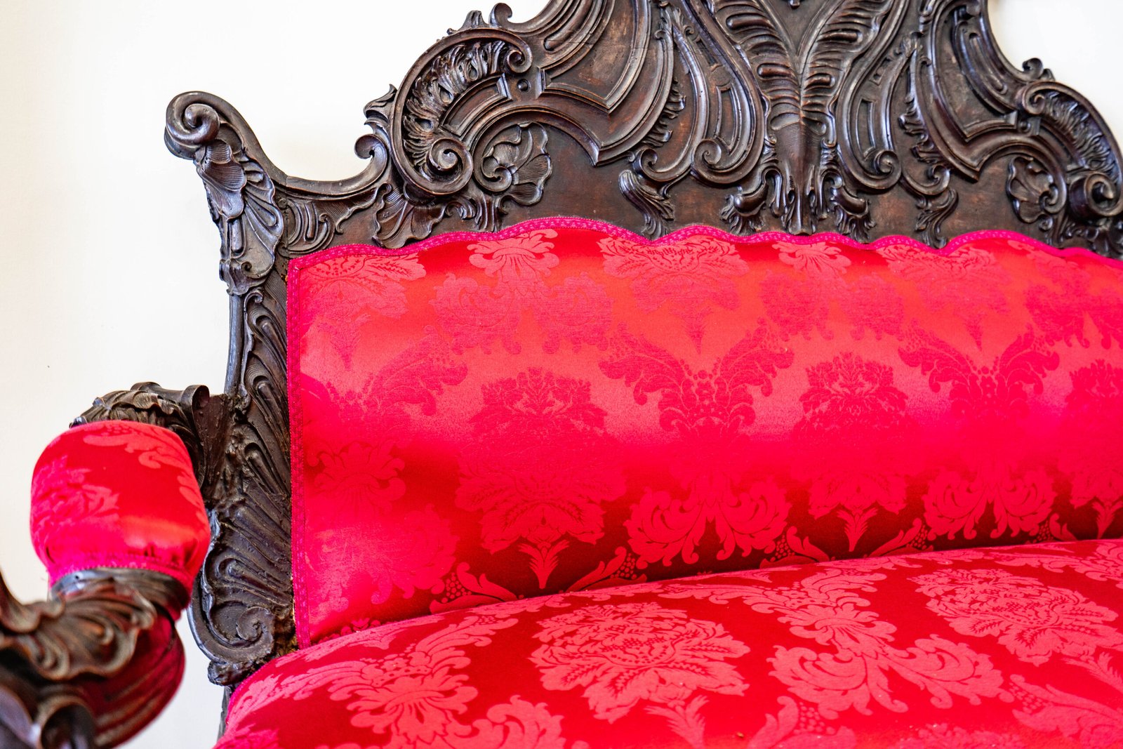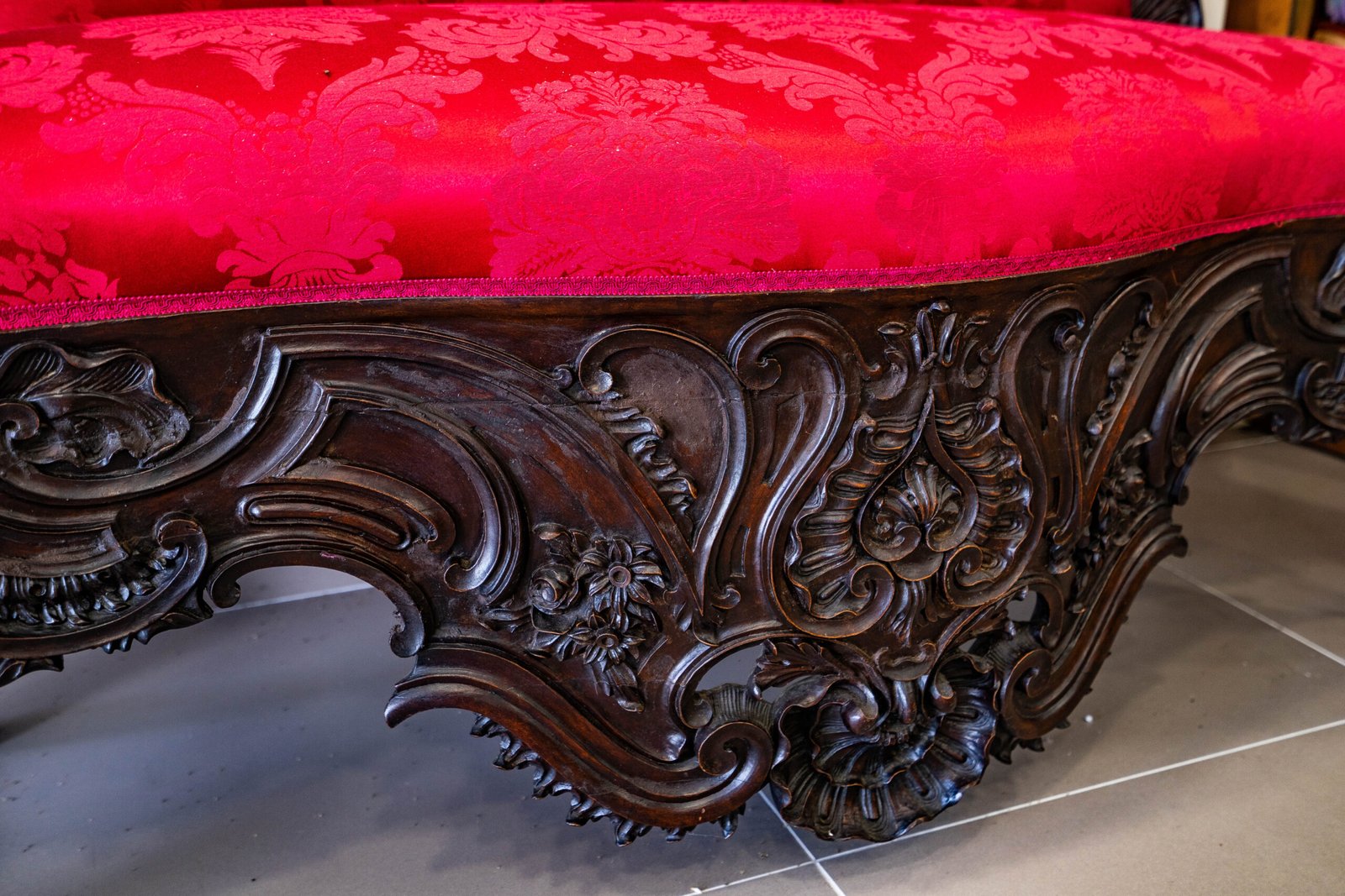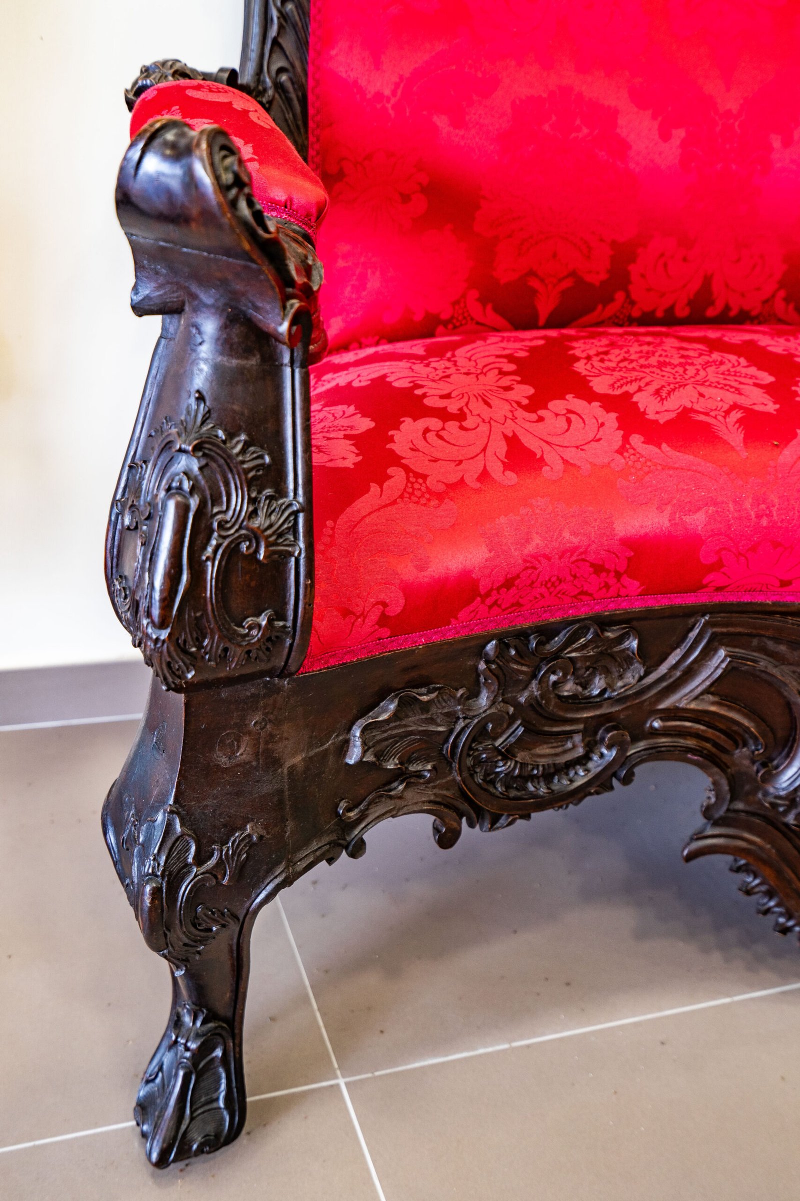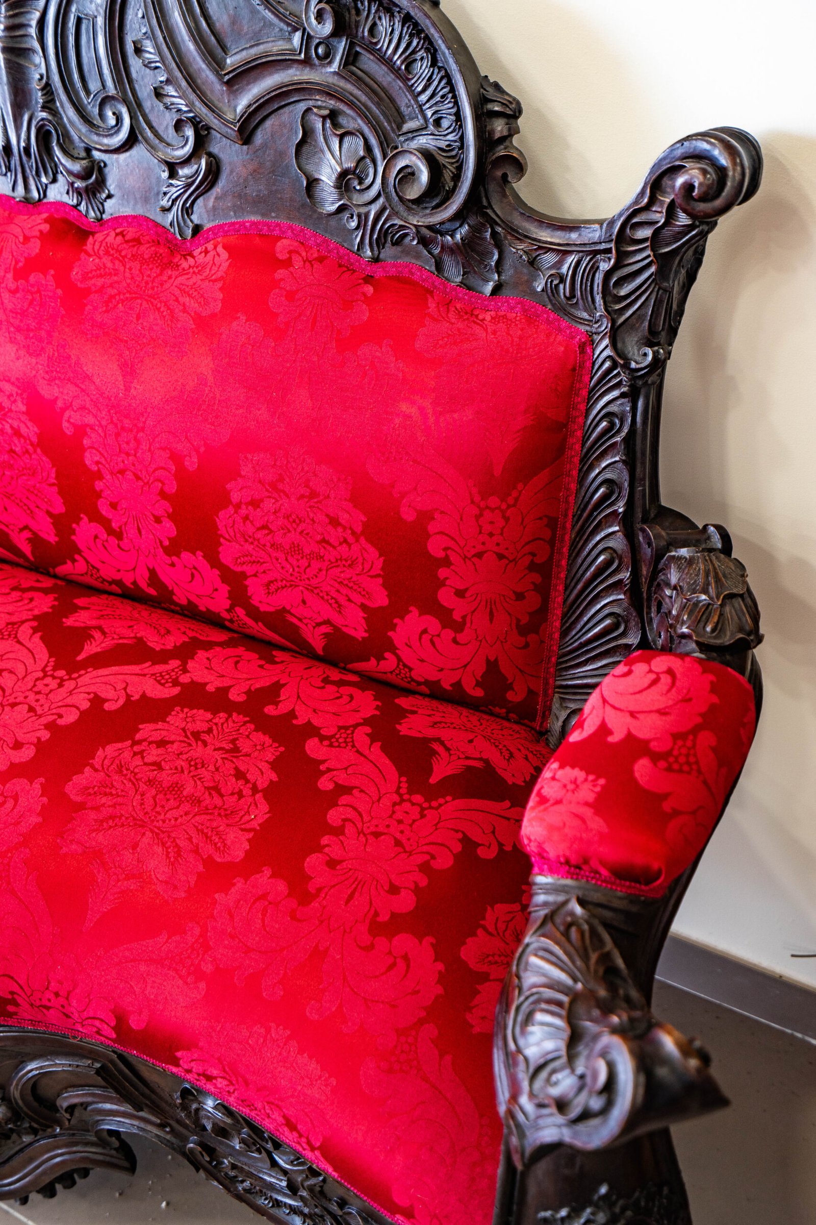 Sofá imponente de dois lugares com estrutura em madeira escura ricamente entalhada. O espaldar e apoios de braços apresentam entalhes simétricos e trabalhados em relevo. O estofo vermelho acetinado com padrão floral acrescenta conforto e teatralidade.