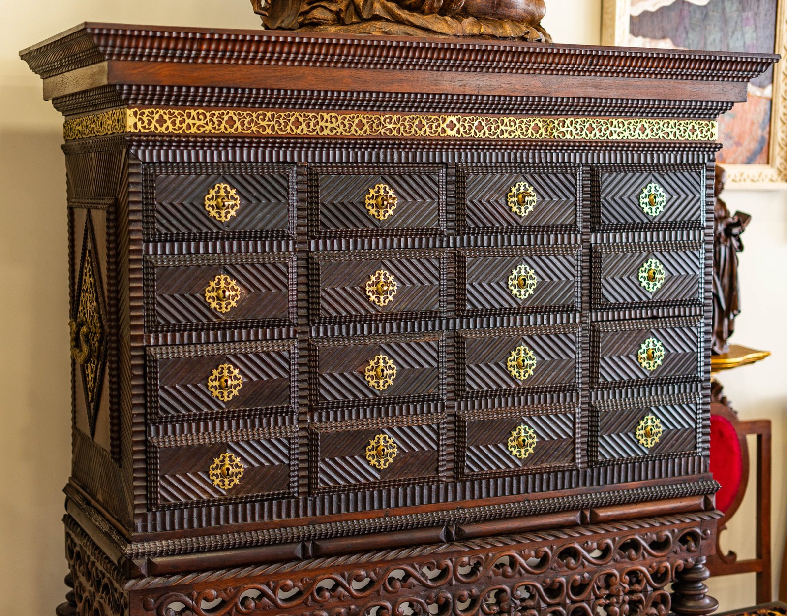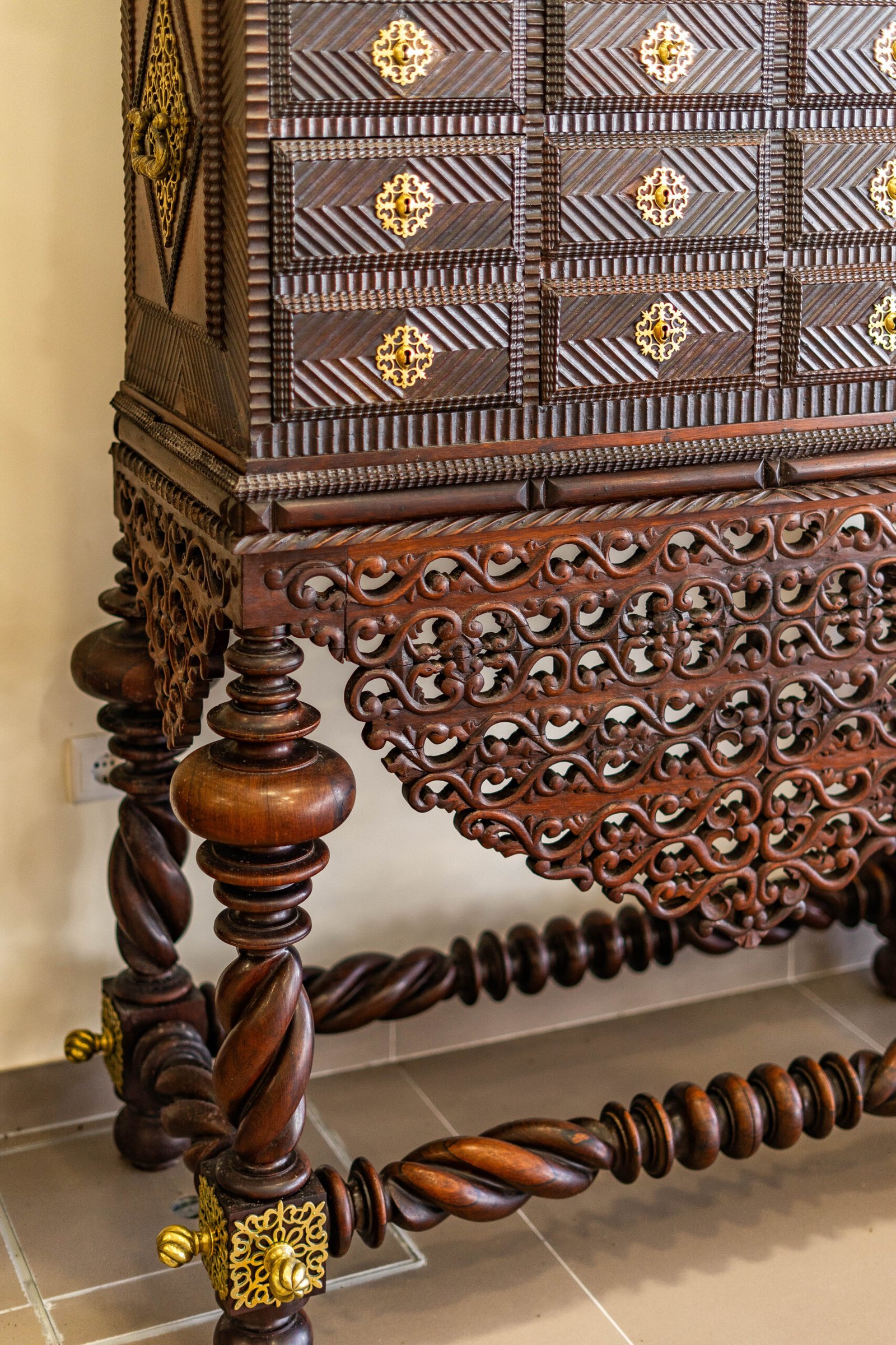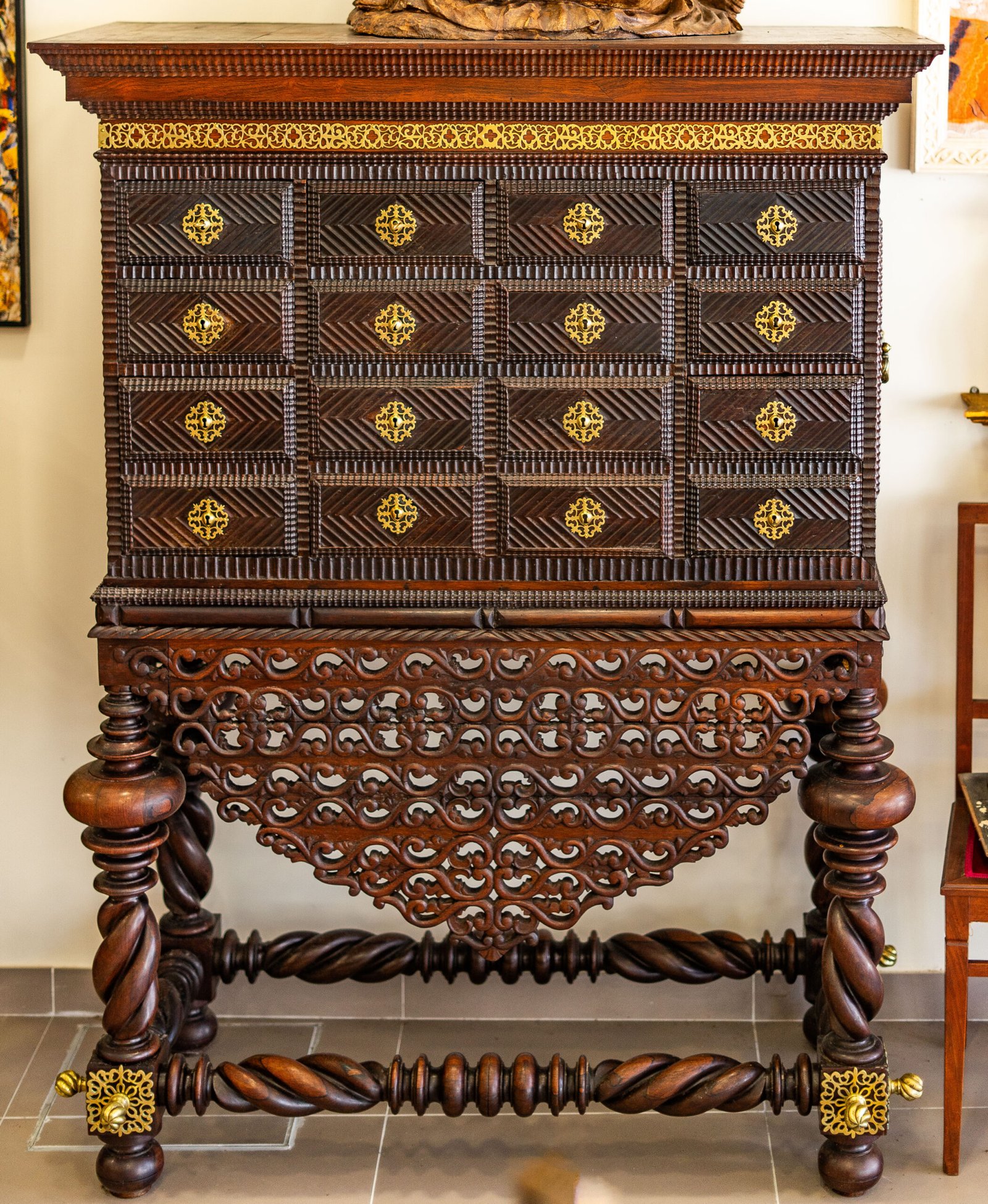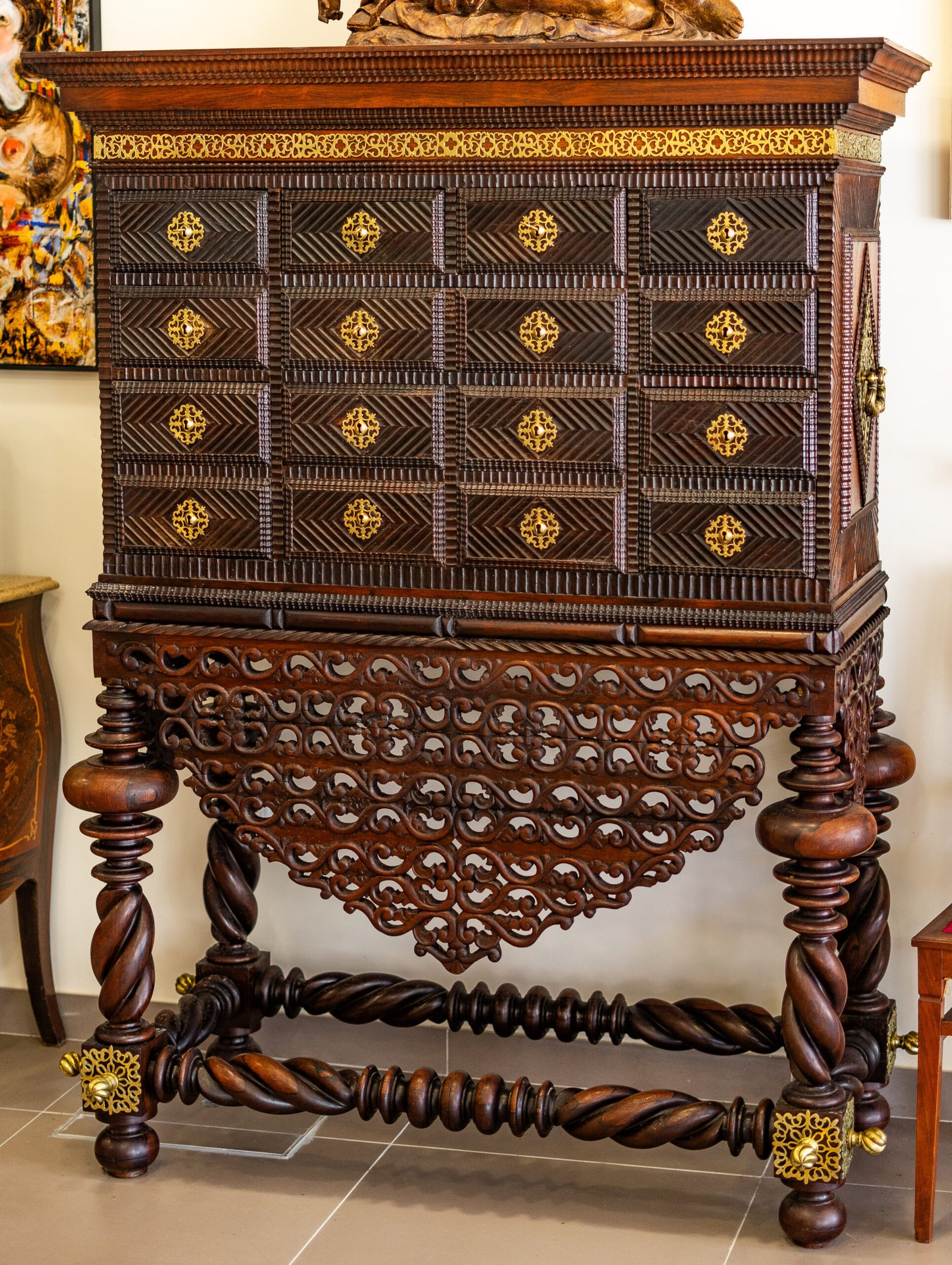 Contador Estilo Português Sec.XVII Pau Santo H 1,72 – L1,27-F60 10 gavetas e moldura de tremidos, talha geométrica, pernas torneadas espiral, ferragens metal dourado
