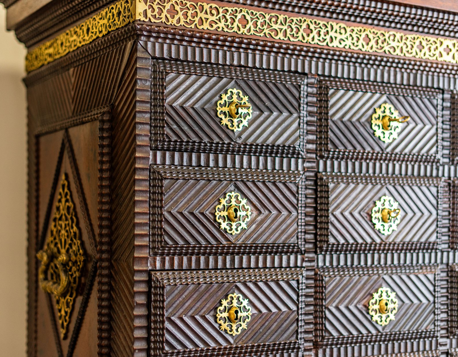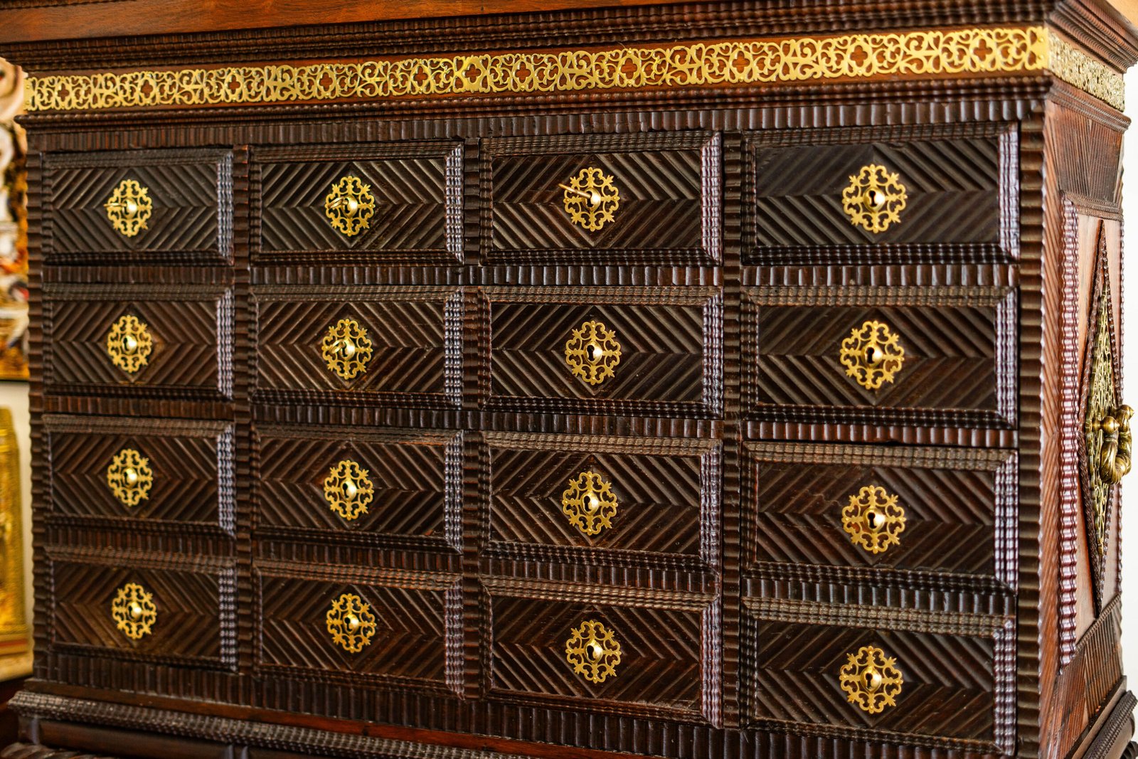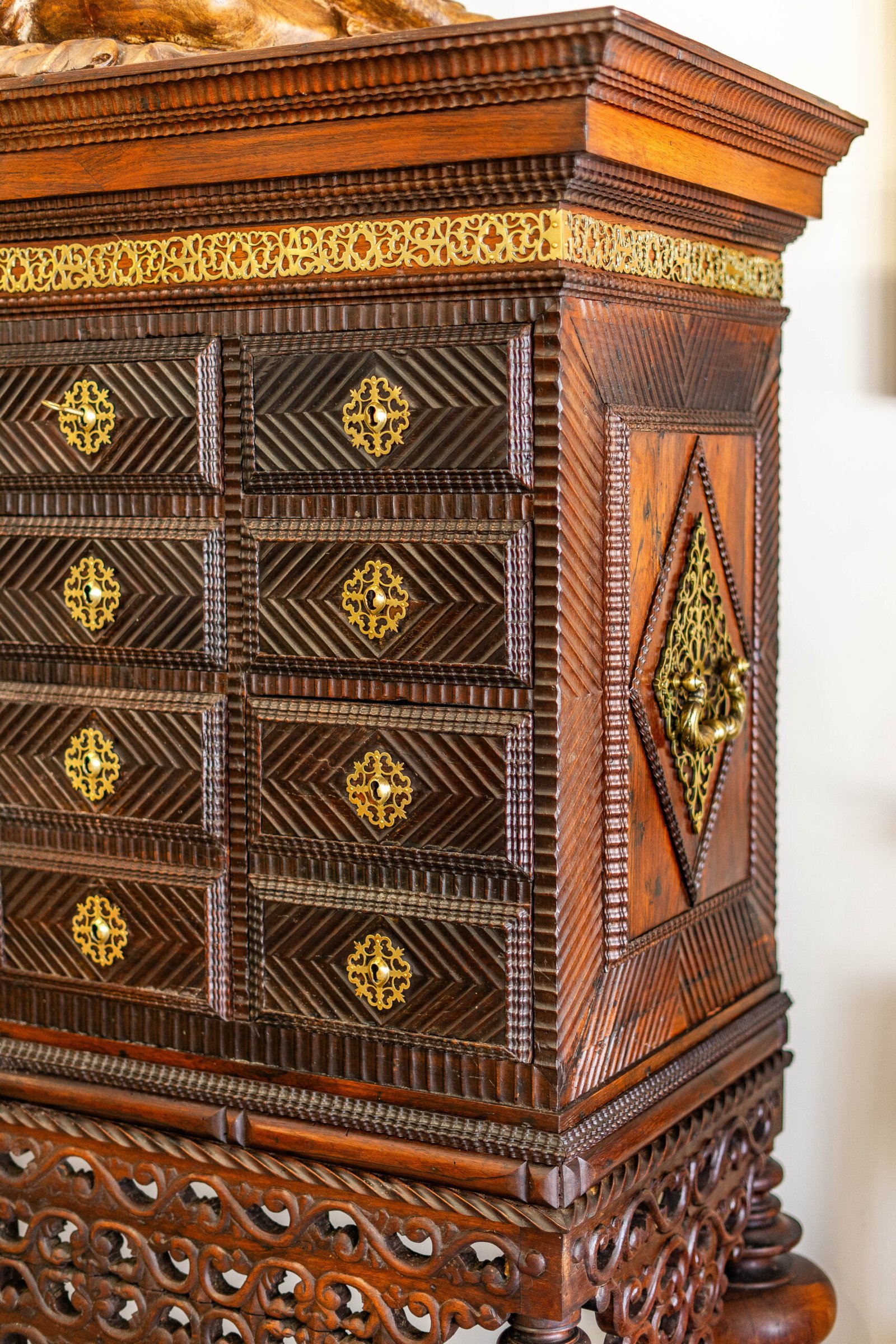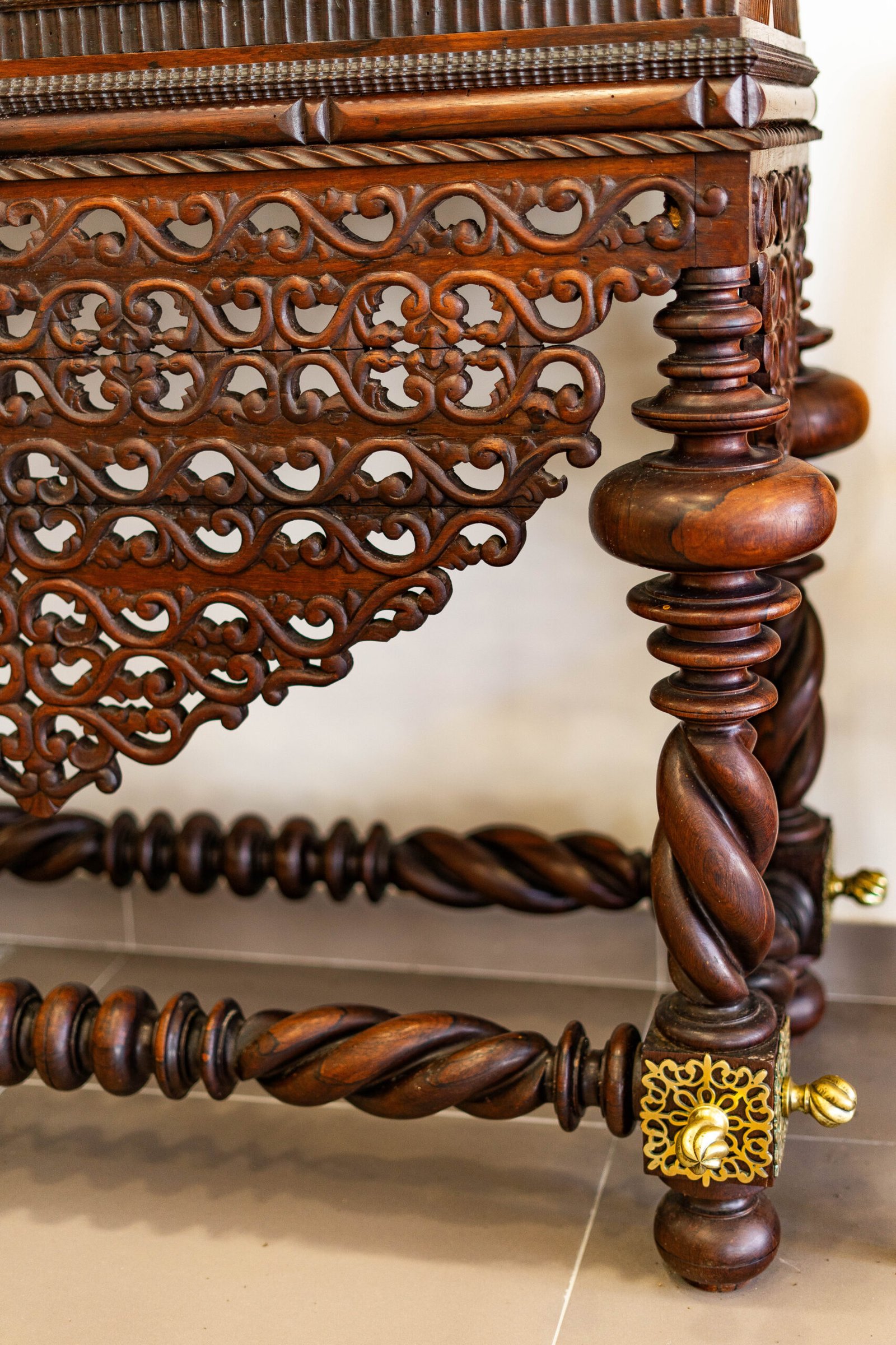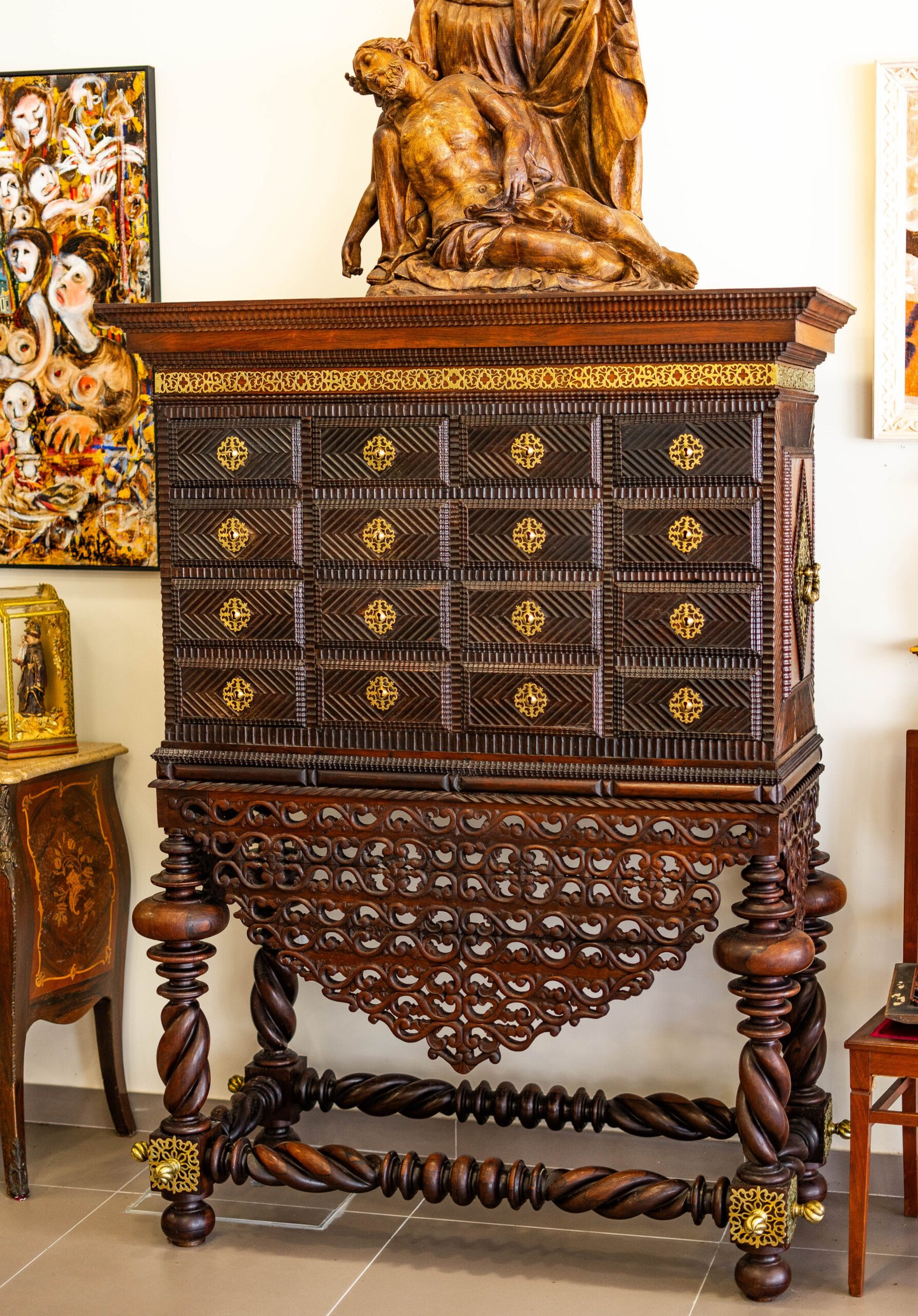 Contador Estilo Português Sec.XVII Pau Santo H 1,72 – L1,27-F60 10 gavetas e moldura de tremidos, talha geométrica, pernas torneadas espiral, ferragens metal dourado