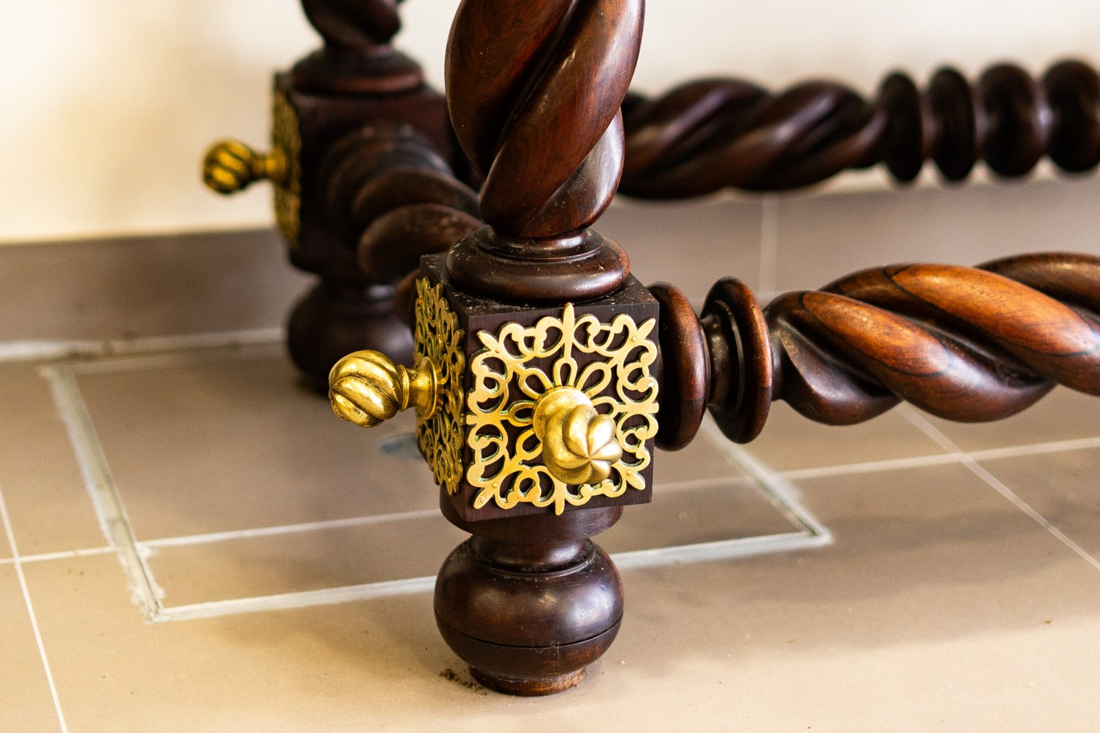 Imponente contador português em madeira escura, com múltiplas gavetas simétricas e puxadores em latão dourado. A estrutura repousa sobre base torneada com pernas em espiral e recortes decorativos, destacando-se pelo trabalho minucioso de carpintaria.