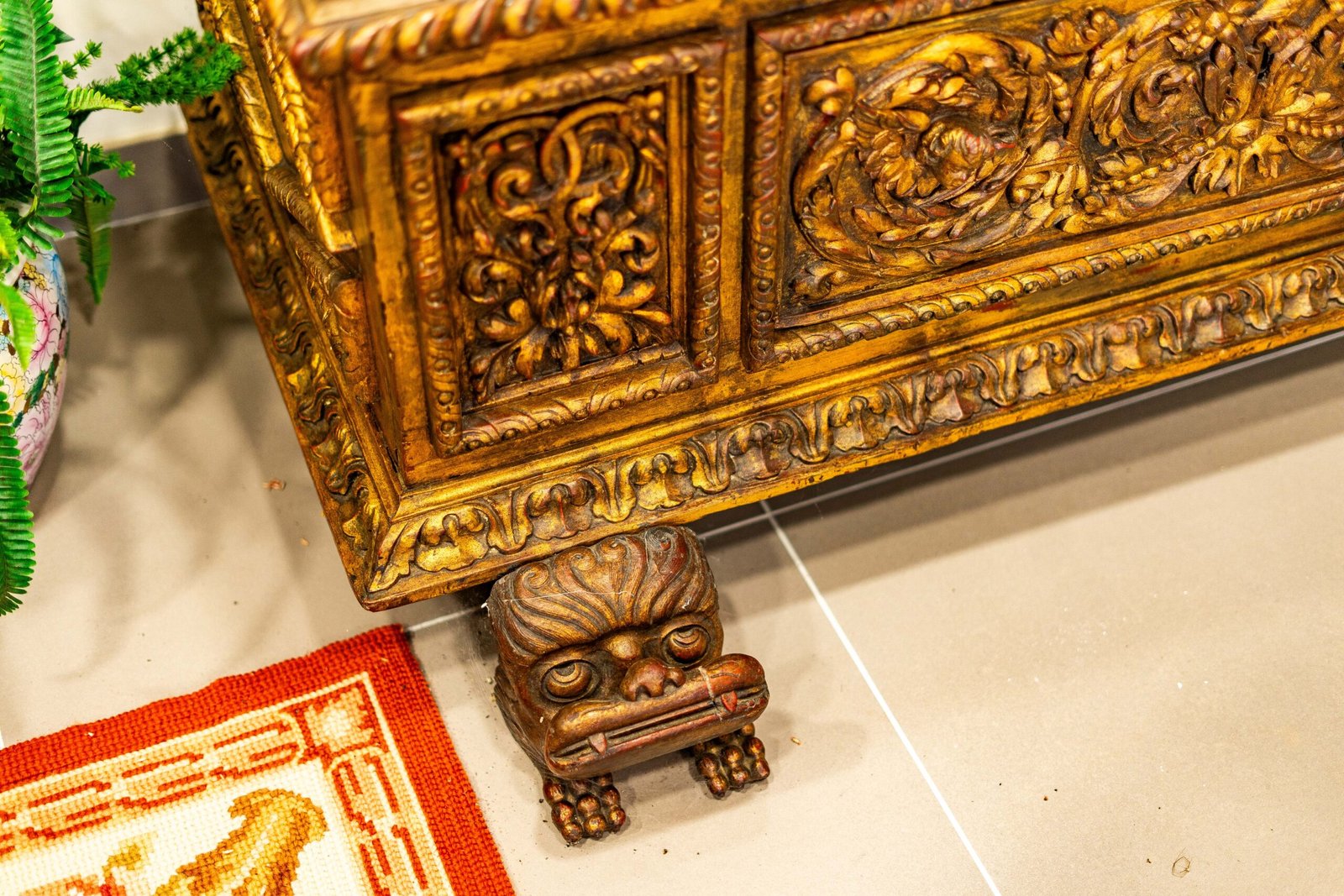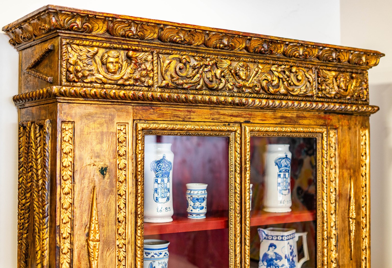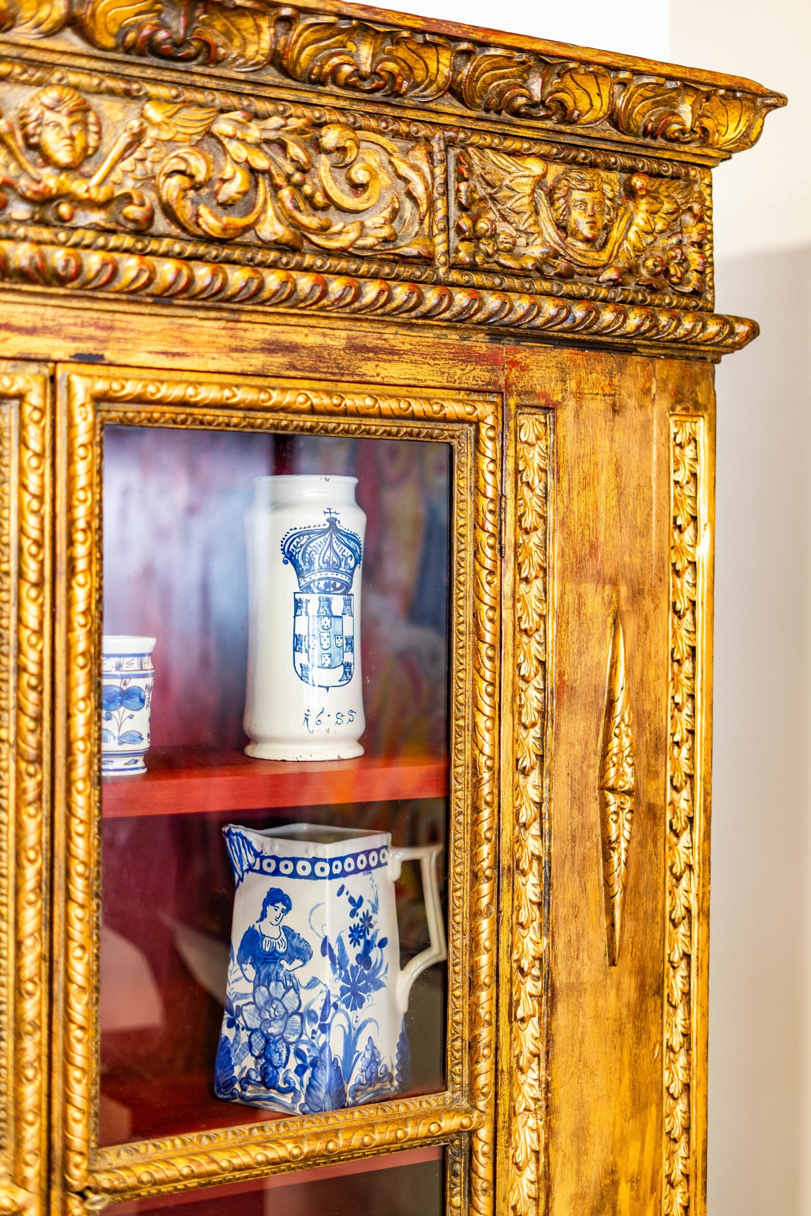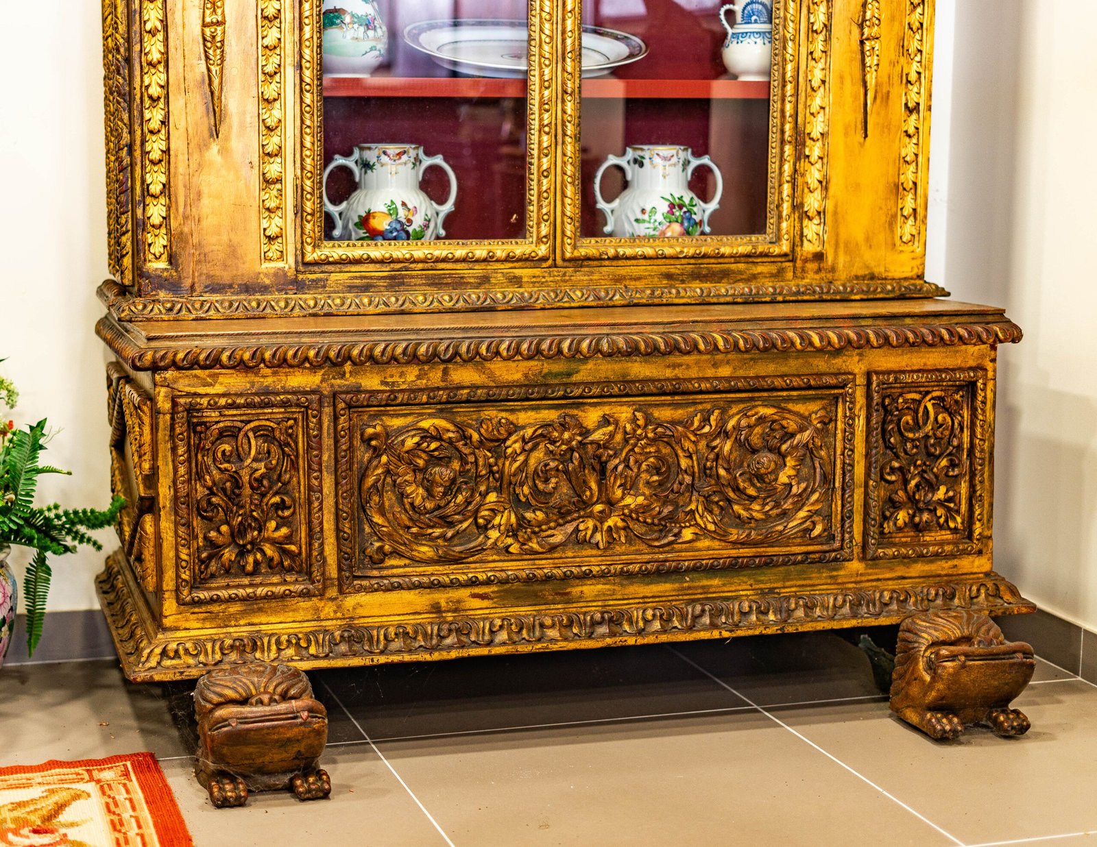 Cristaleira ricamente entalhada com acabamento dourado envelhecido. Composta por quatro portas envidraçadas na parte superior, ideal para exibição de peças decorativas. A base maciça contém entalhes florais em relevo e pés zoomórficos que evocam prestígio.
