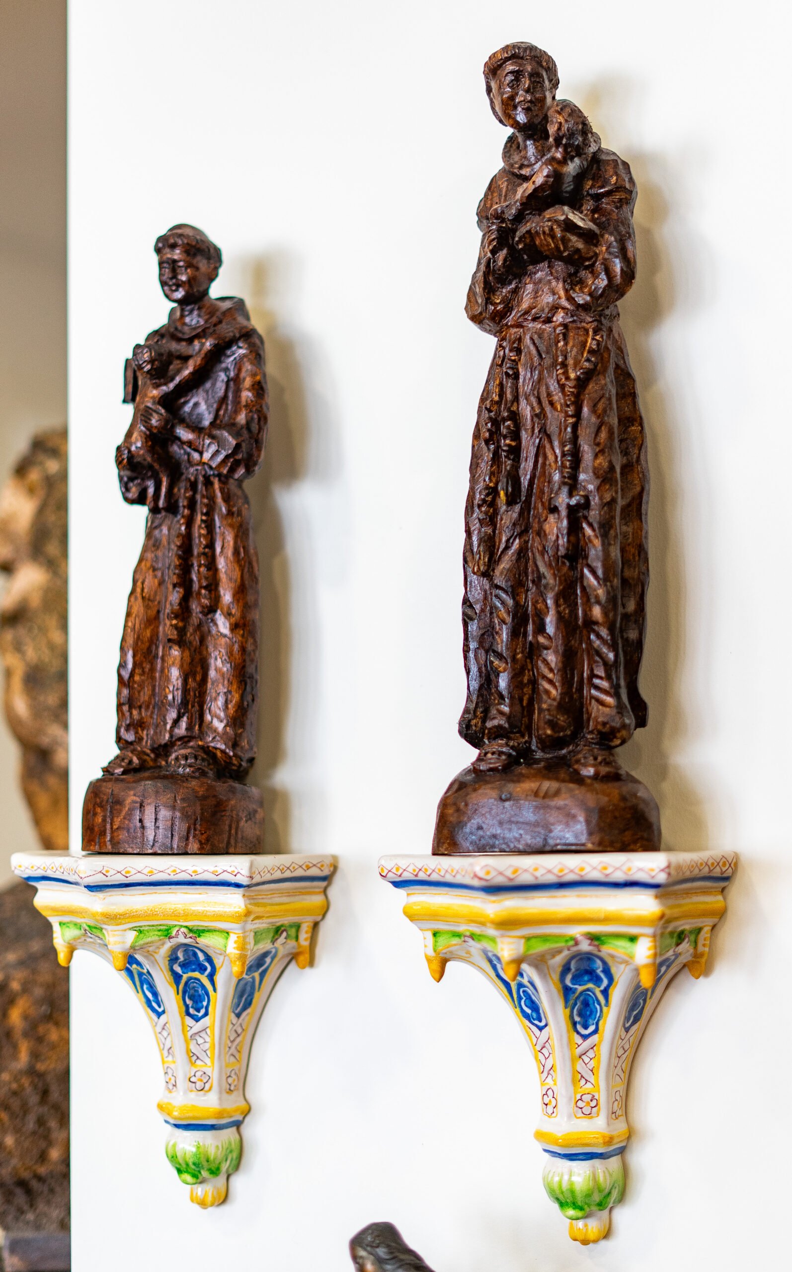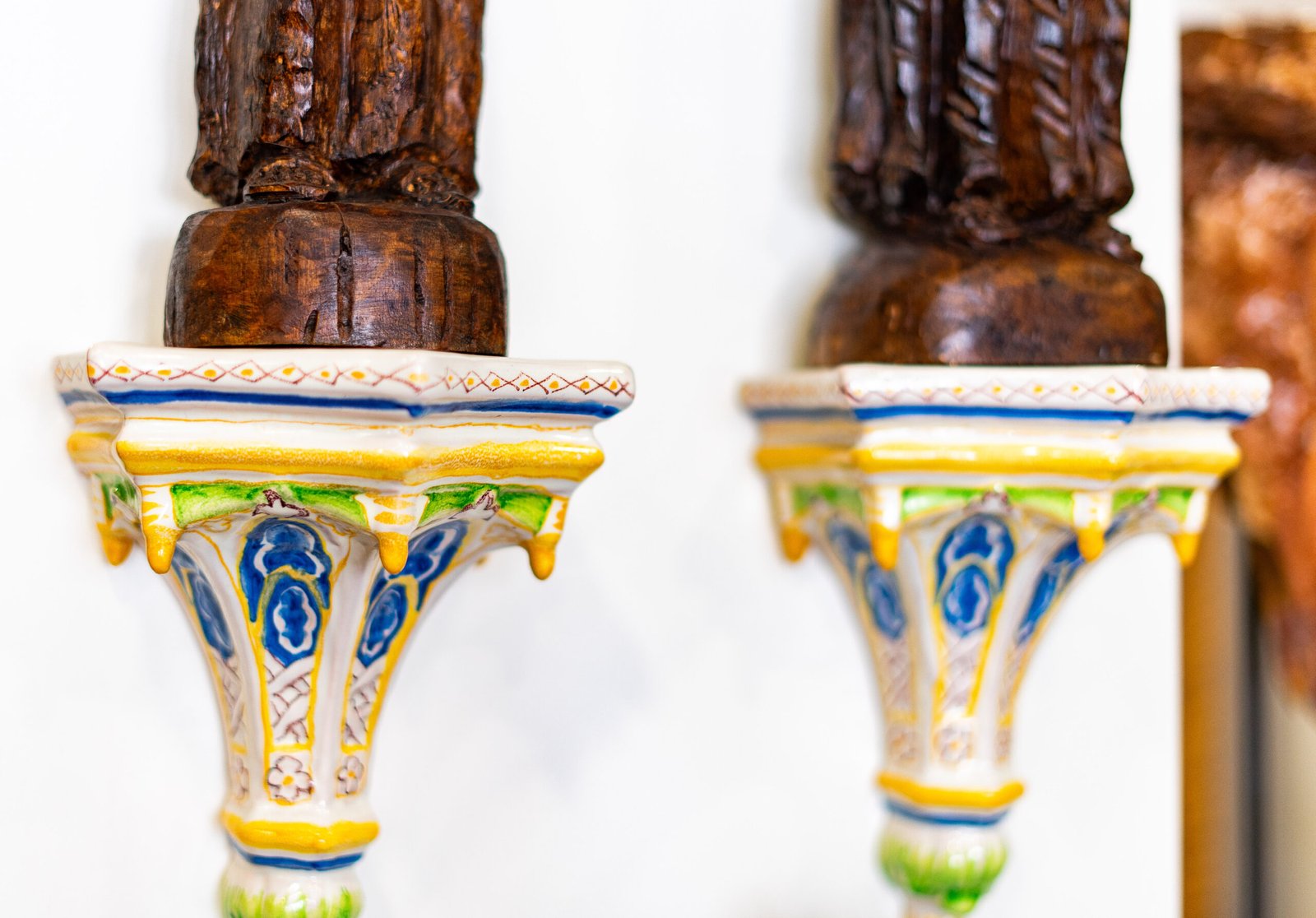 As peças assentam sobre elegantes mísulas em faiança pintada à mão, com motivos florais e geométricos de inspiração renascentista, em tons de azul, amarelo, verde e rosa. O conjunto conjuga o sagrado e o artesanal, ideal para espaços devocionais, galerias ou ambientes com decoração religiosa clássica.