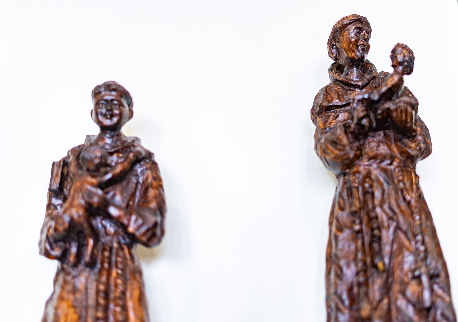 Conjunto de duas esculturas em madeira representando santos franciscanos: uma figura segura um livro sagrado e a outra, São António de Lisboa, carrega o Menino Jesus ao colo com expressão terna e contemplativa. Ambas as imagens destacam-se pelo entalhe profundo e rústico, de traço manual e expressividade marcante.
