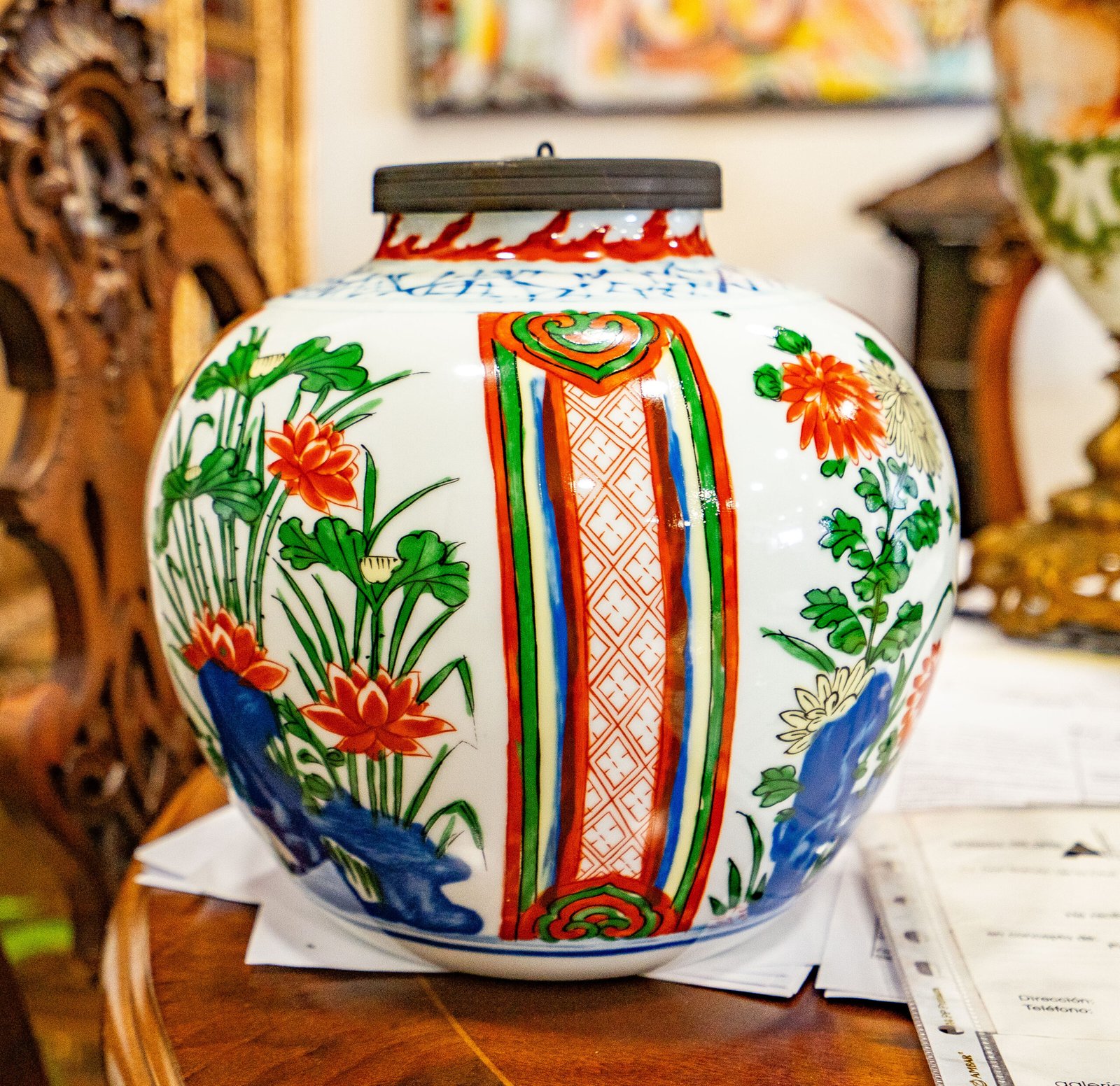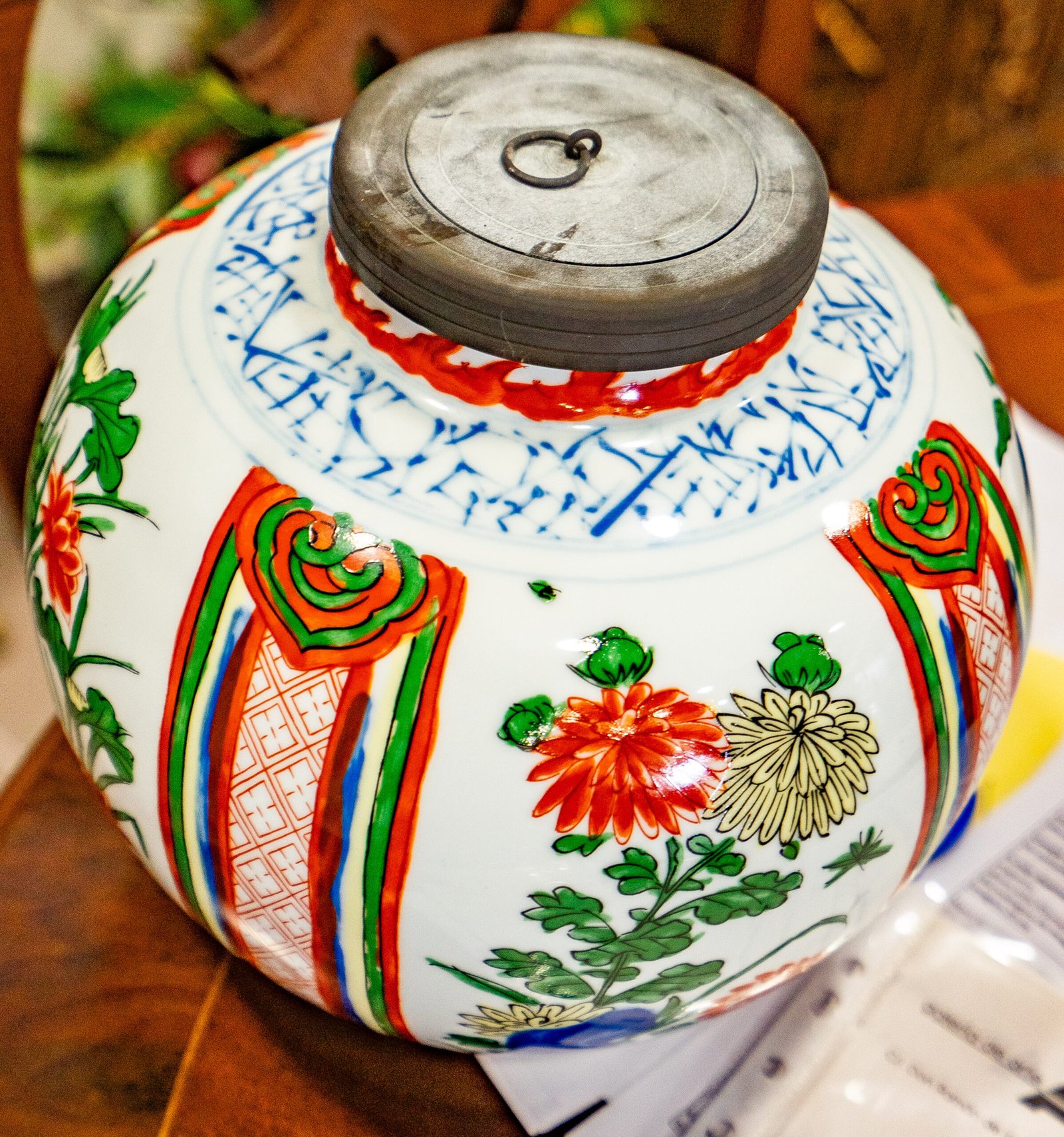 Jarro de porcelana japonesa de grande volume, decorado com pintura policromada e elementos em azul sob o vidrado. A peça apresenta um corpo bojudo, com tampa metálica escura (possivelmente em ferro patinado) equipada com argola central, sugerindo uso funcional e/ou decorativo.