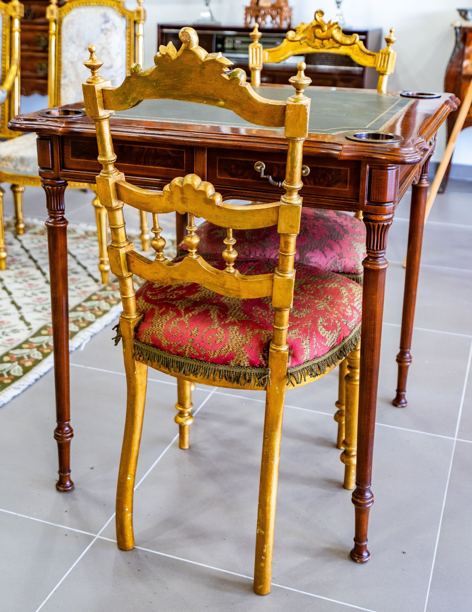 Conjunto composto por uma secretária clássica em madeira nobre com tampo em pele verde e delicadas linhas torneadas, acompanhada por uma cadeira dourada com encosto recortado e estofado em tecido vermelho adamascado. A secretária possui pequenas gavetas com puxadores metálicos elegantes, ideal para uso decorativo ou funcional.