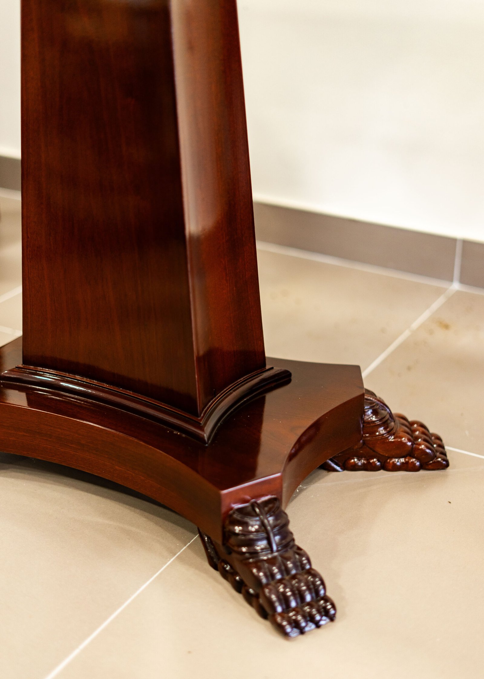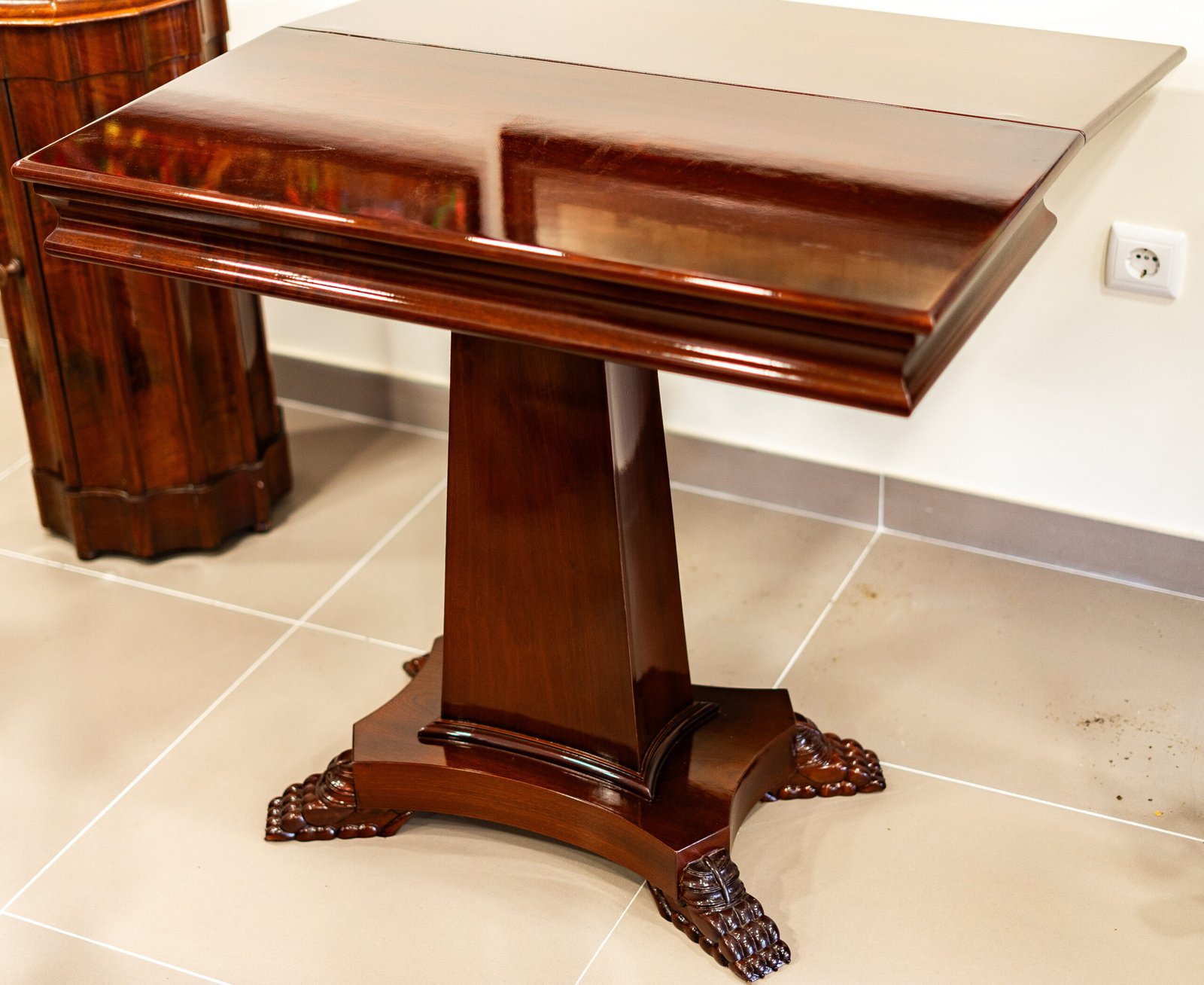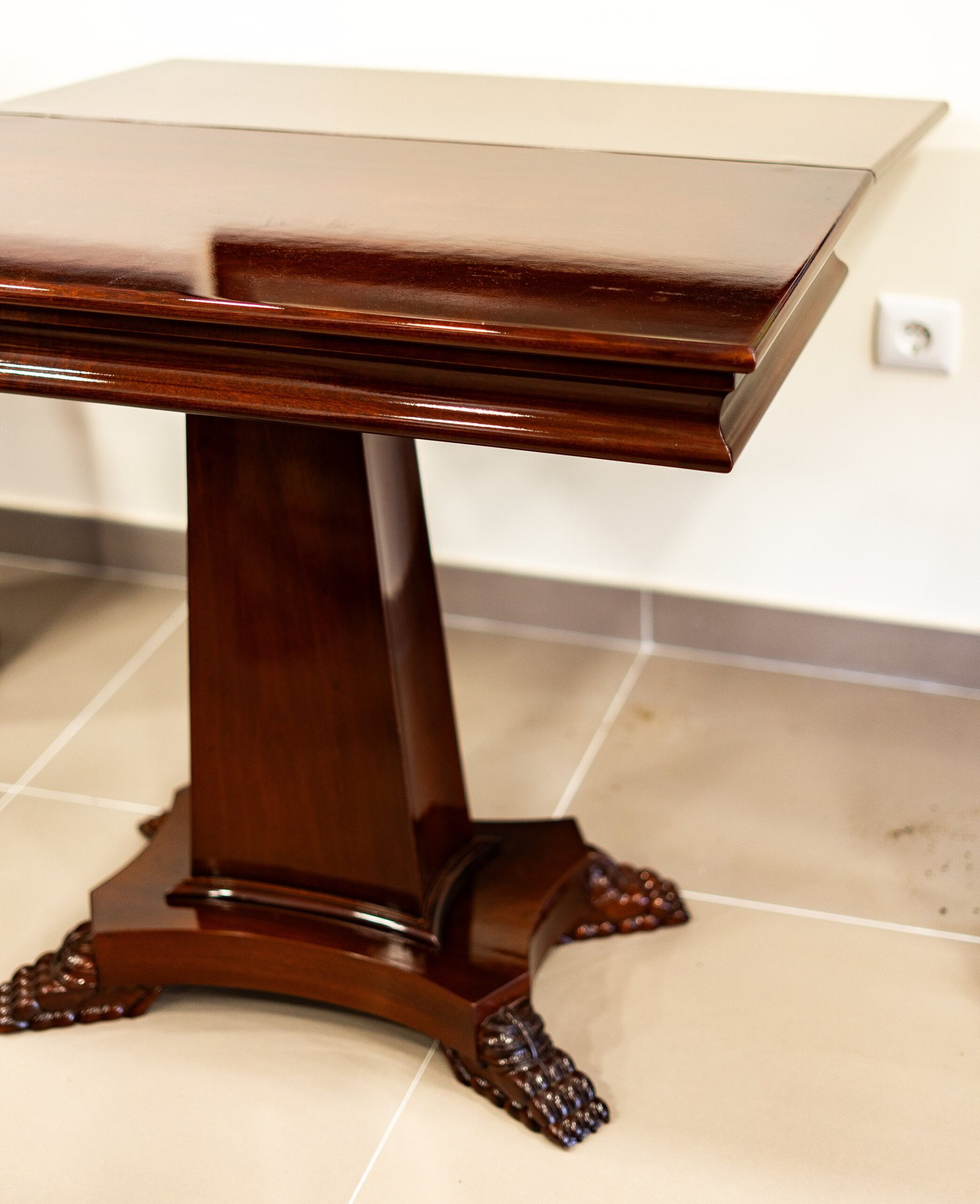 Mesa de apoio estilo Império em madeira de tom escuro com acabamento polido. Apresenta um único pé central prismático assente numa base em cruz com pés entalhados em forma de garras. O tampo retangular destaca-se pela sua superfície lisa e brilhante.