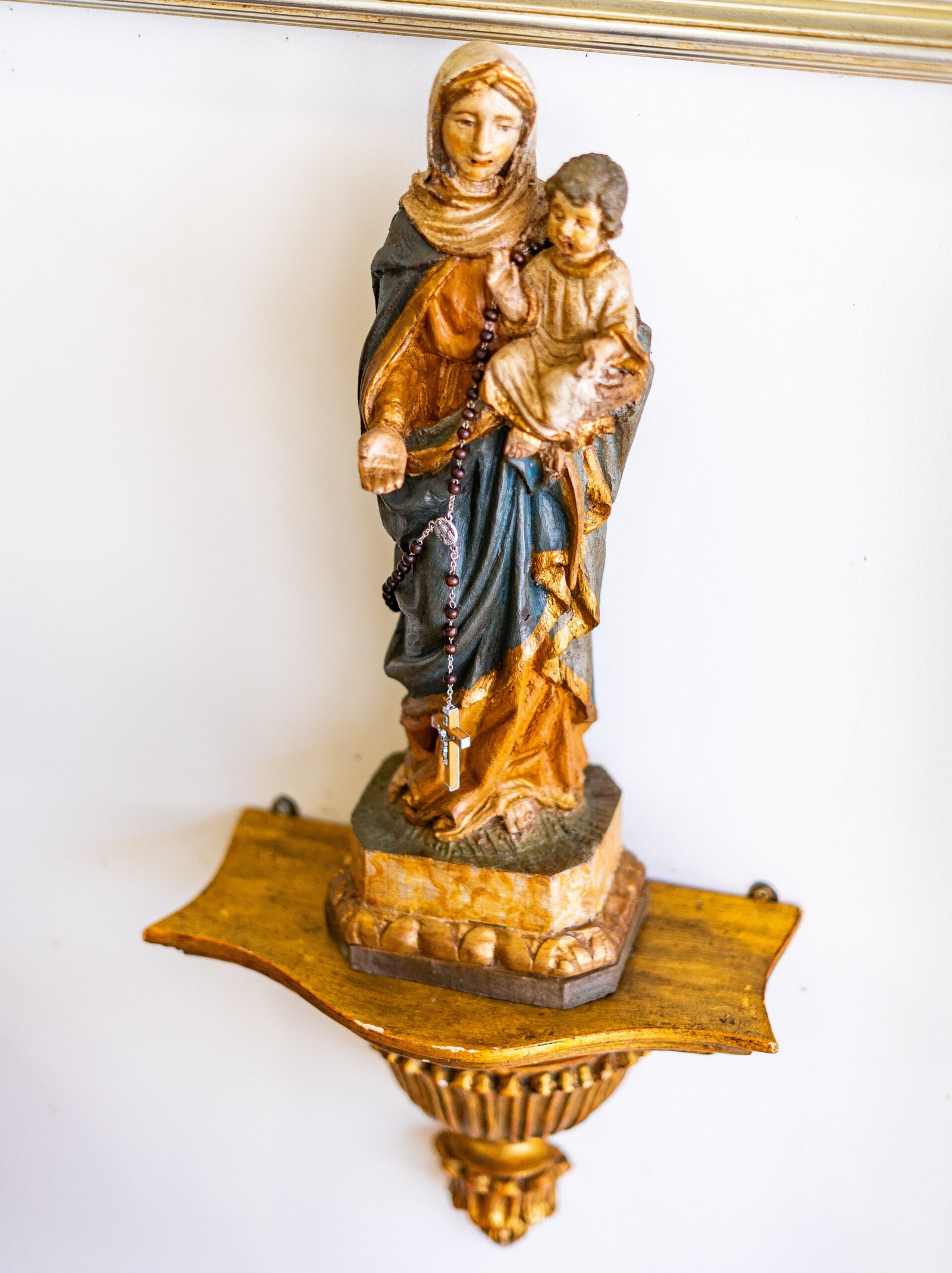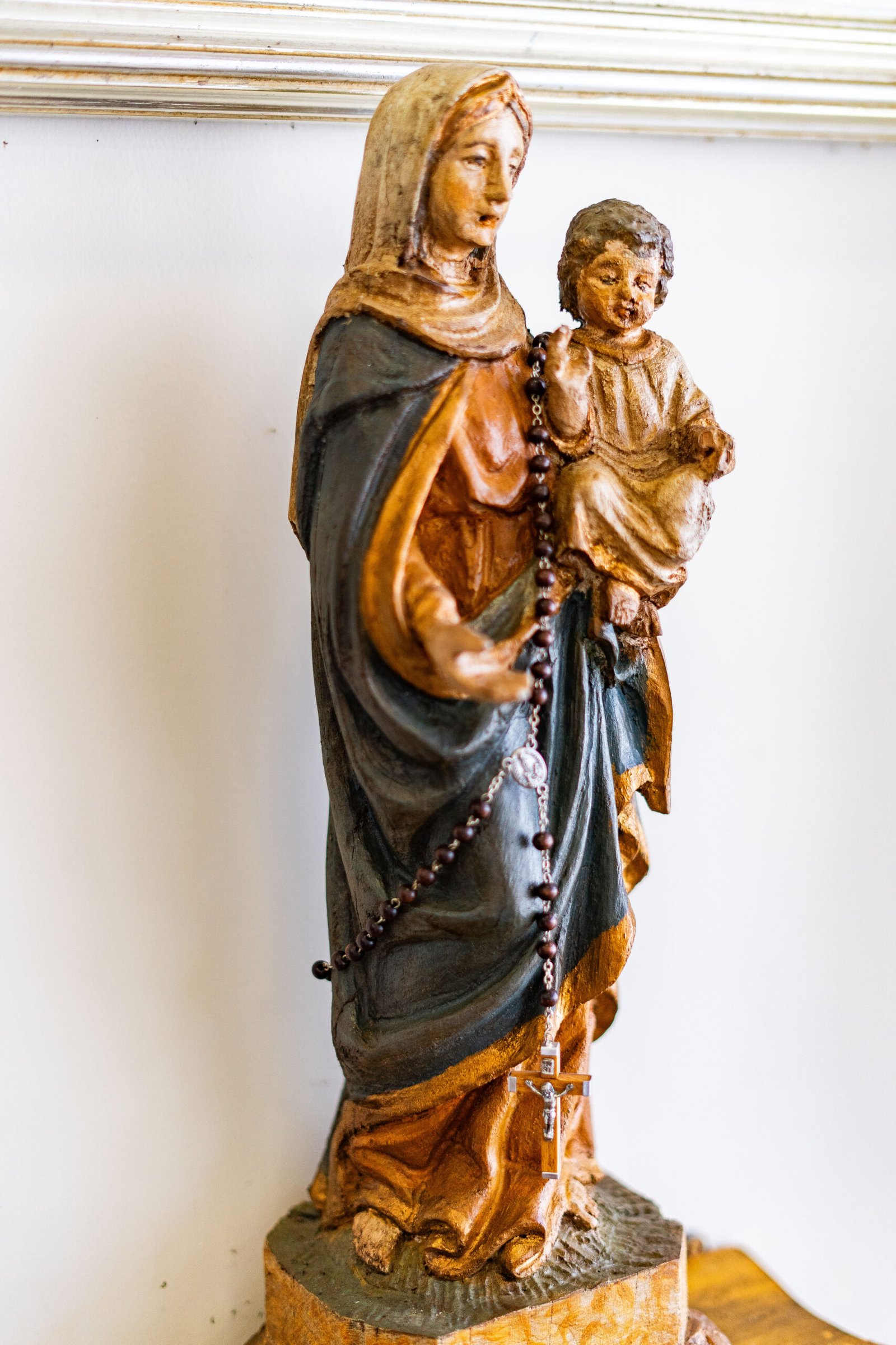 Delicada escultura religiosa representando Nossa Senhora com o Menino ao colo, trabalhada em madeira entalhada e policromada com tons ricos e suaves. A figura materna segura um terço em madeira com cruz metálica pendente, reforçando o simbolismo devocional da peça.
