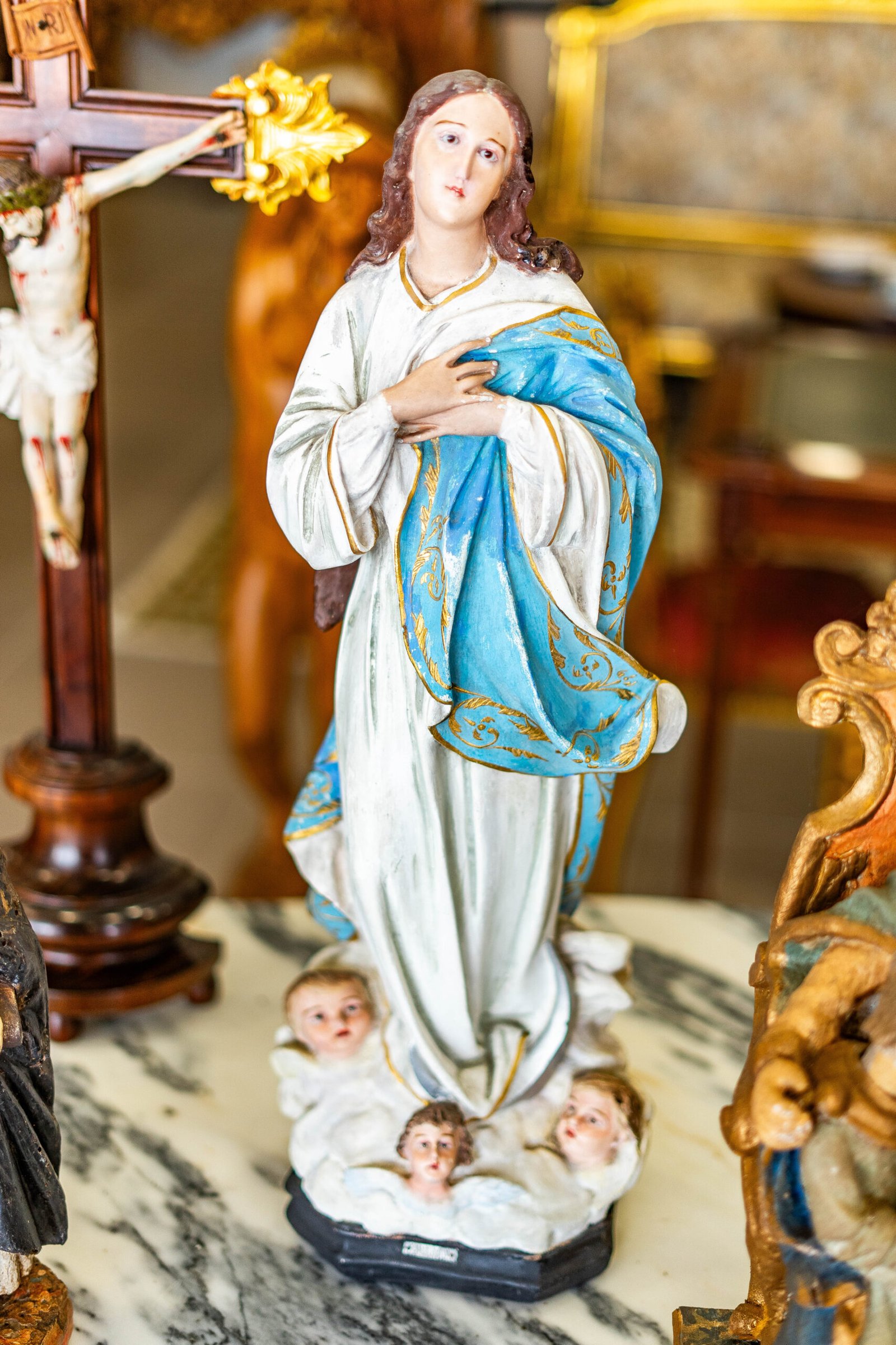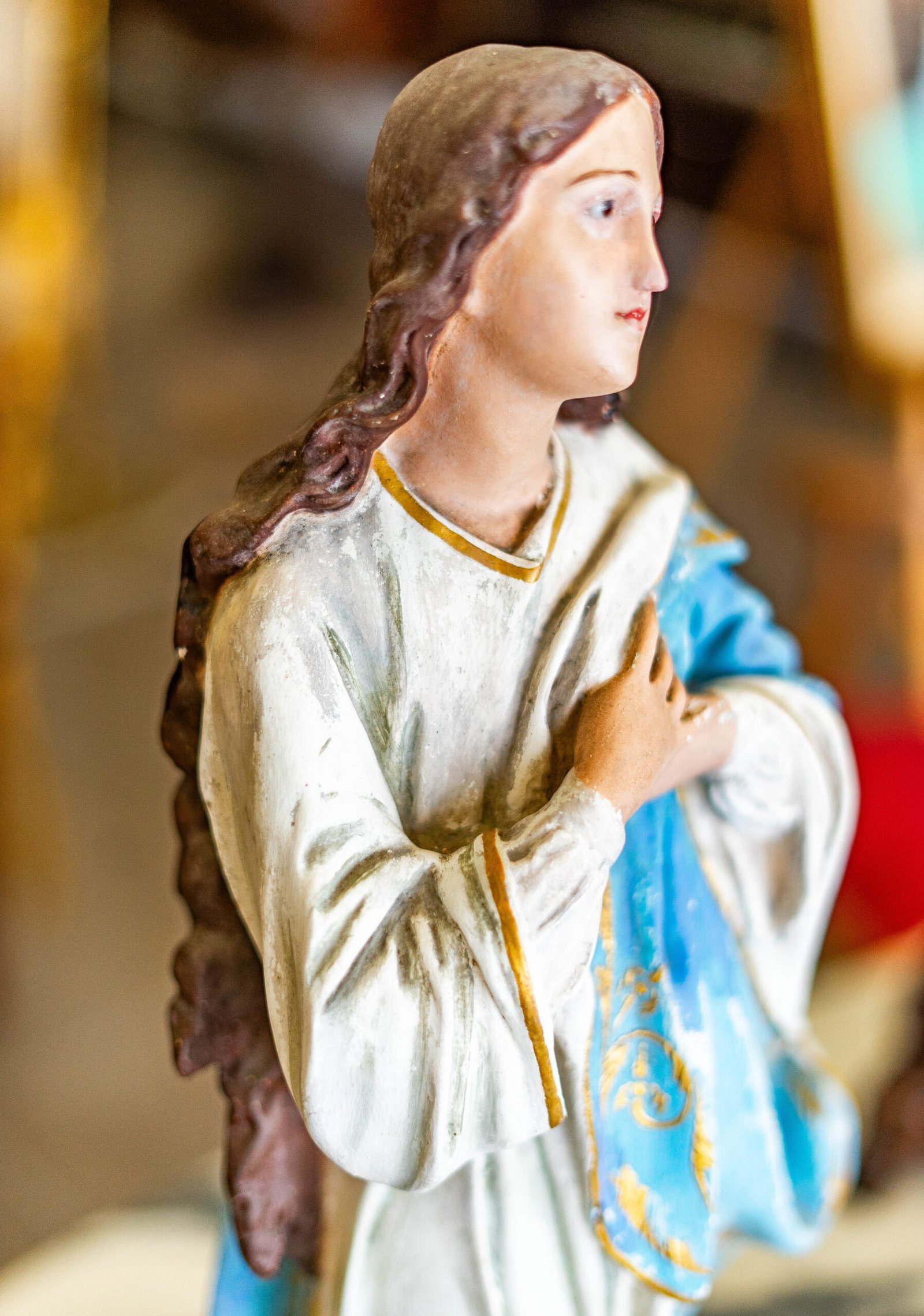 Escultura em gesso pintado à mão, com especial atenção aos detalhes do rosto, vestes e expressão espiritual. Peça devocional com forte simbolismo mariano, ideal para colecionadores de arte sacra ou espaços de oração e contemplação.