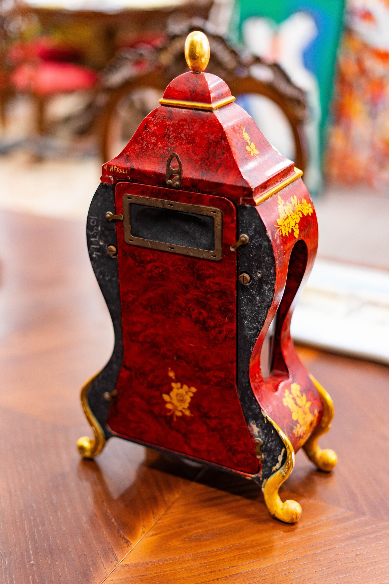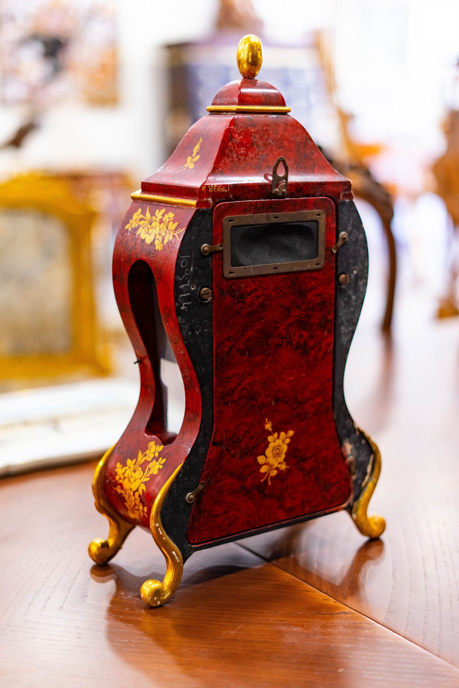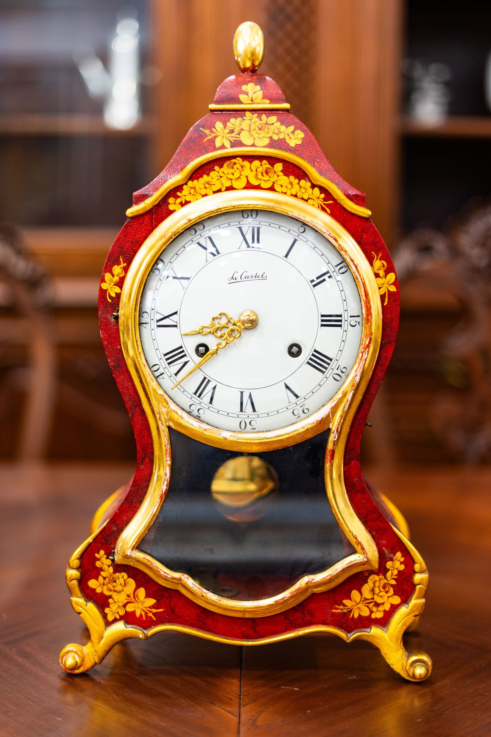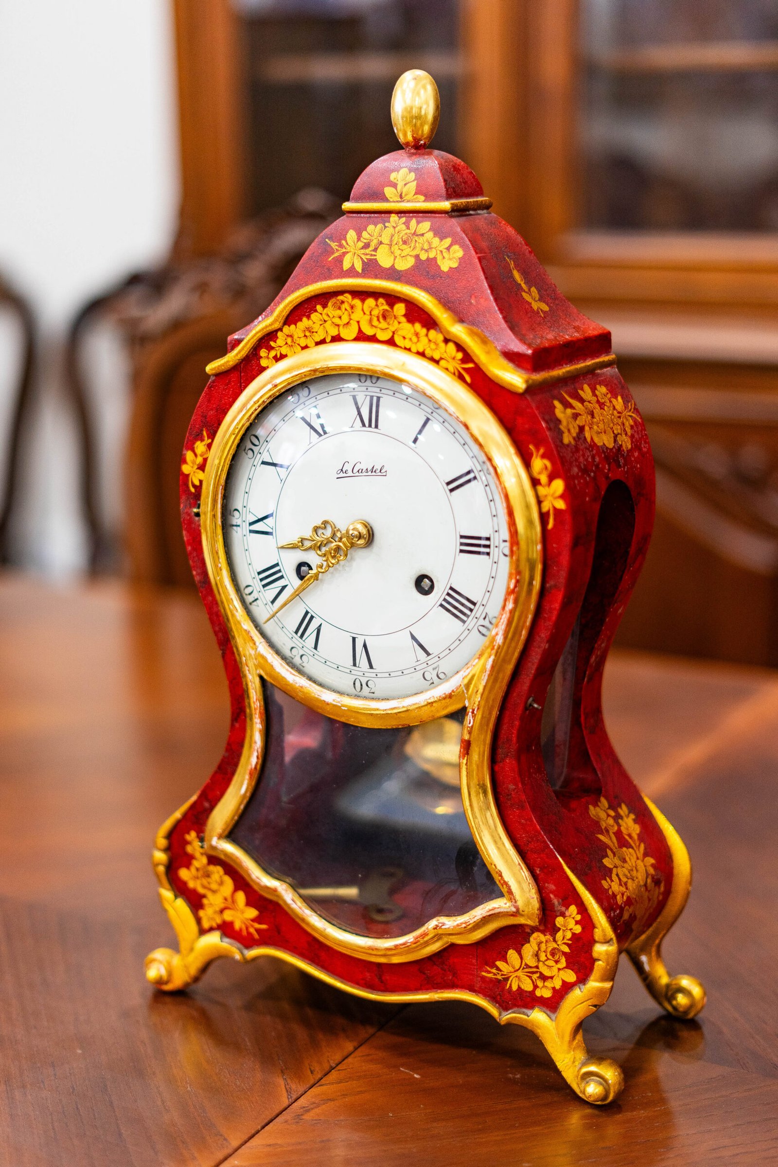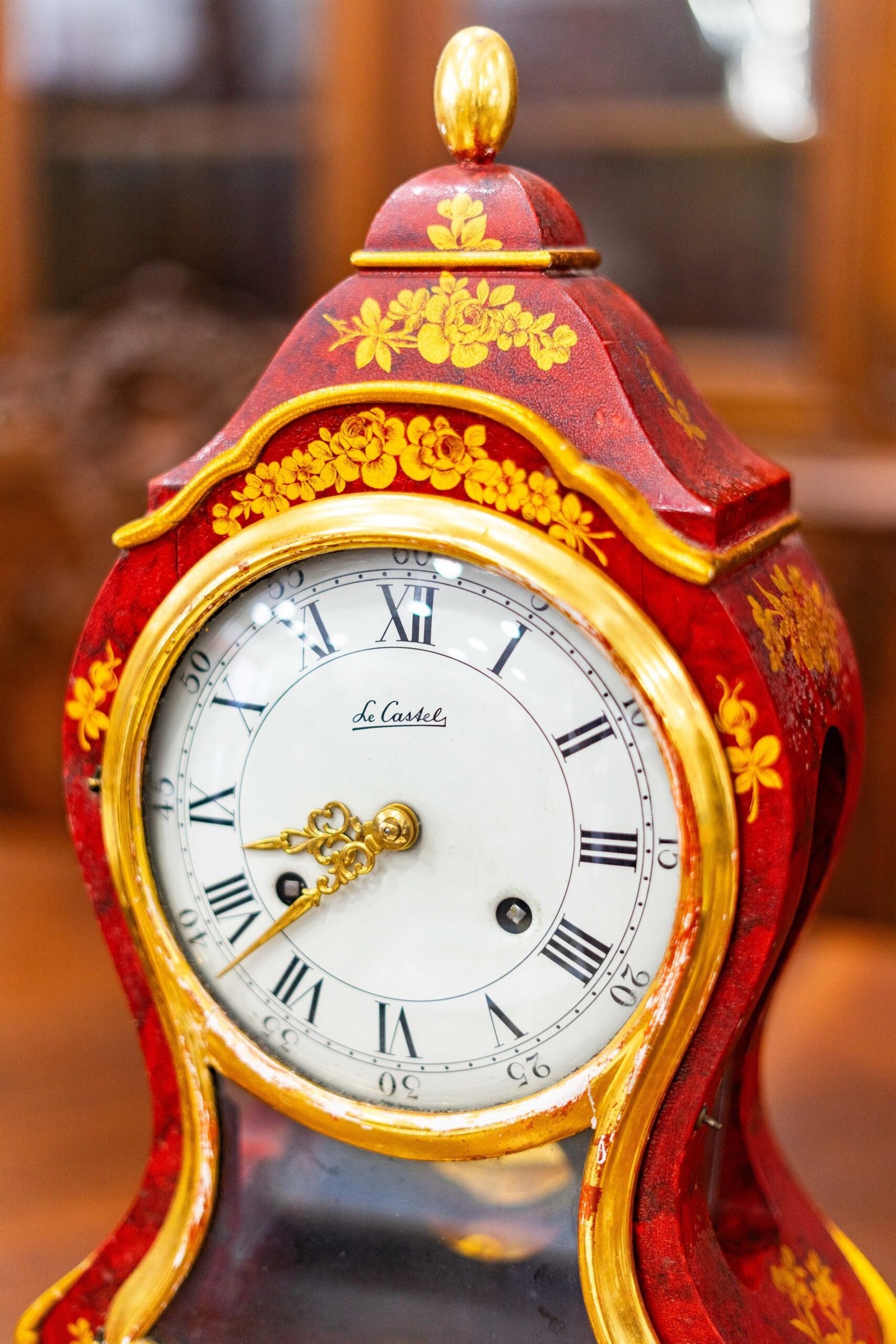 Elegante relógio de mesa com corpo em madeira lacada em vermelho profundo, ricamente ornamentado com padrões florais dourados aplicados em técnica de decalque ou pintura manual. A silhueta sinuosa e as curvas acentuadas evocam o estilo rococó francês, combinando graciosidade com opulência decorativa.