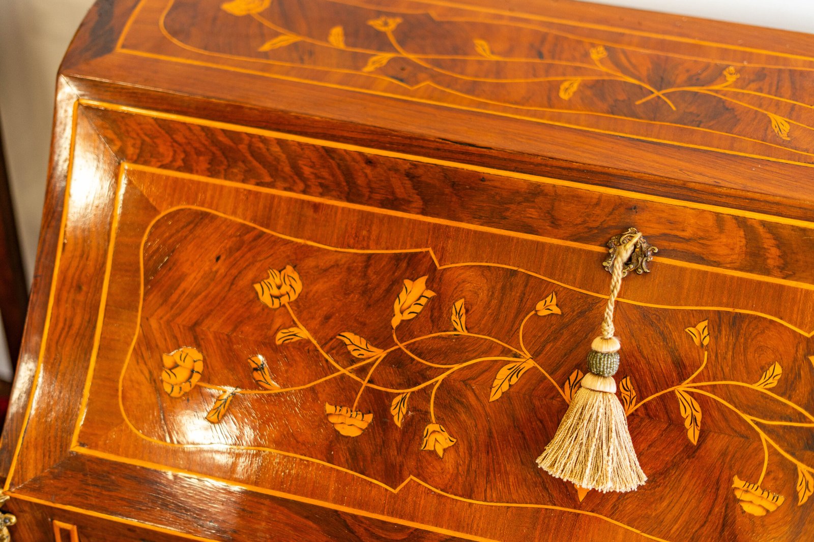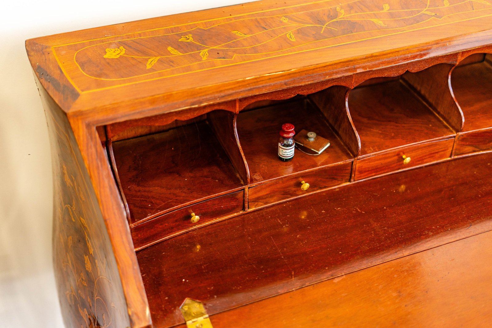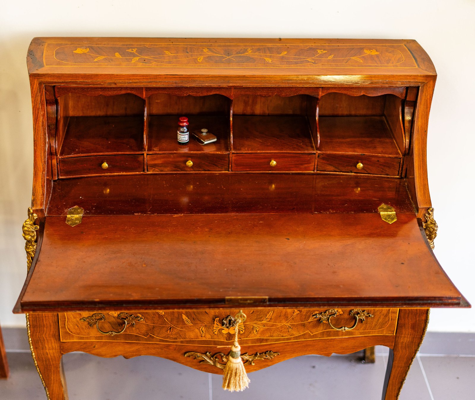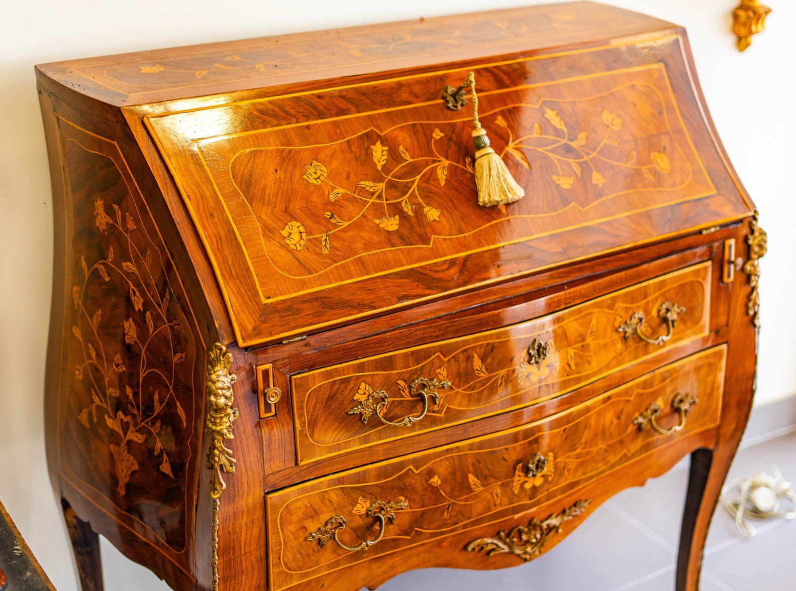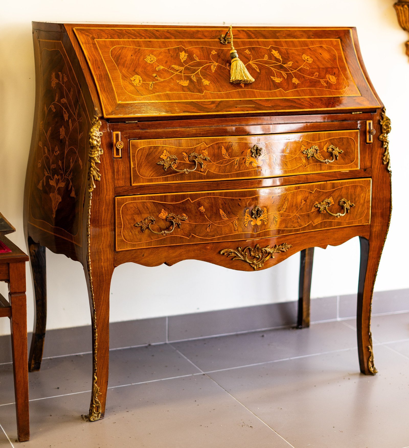 Secretária Bombée estilo Luís XV, com marchetaria floral