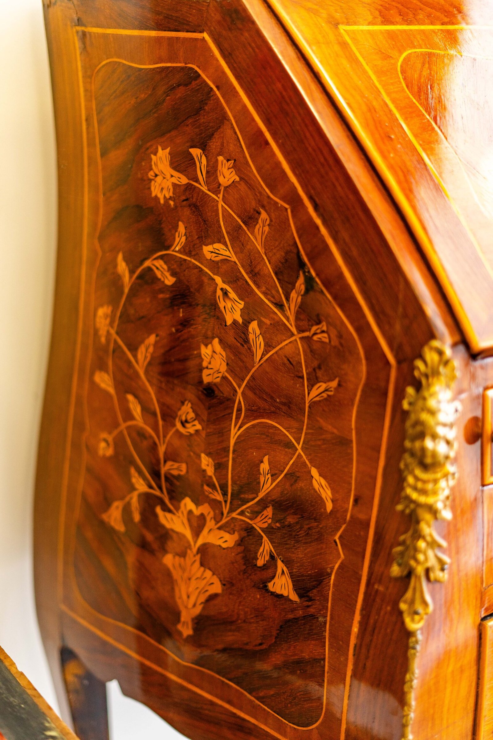 Secretária de tampo abatível, estilo bombée, com três gavetas e marchetaria floral sobre madeira de tons quentes. As aplicações douradas nos cantos e pés elevam o seu carácter ornamental. O tampo revela um compartimento para escrita ou arrumação.