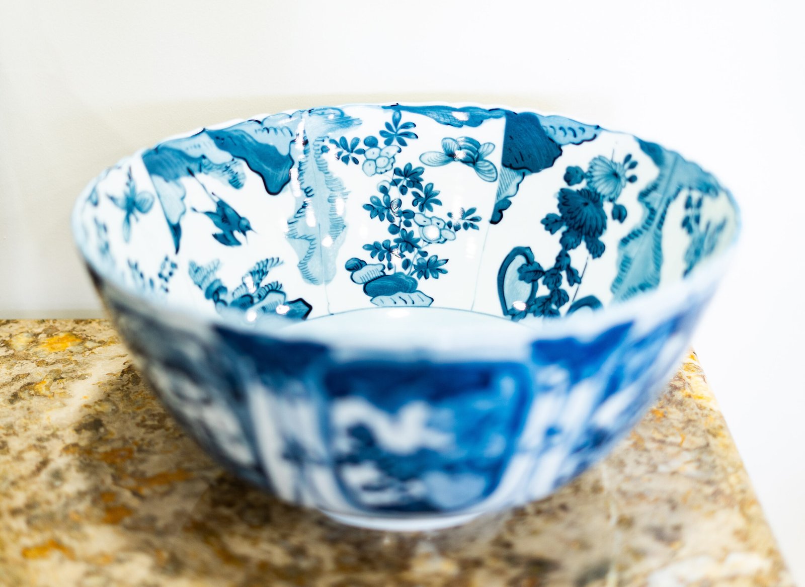 As paredes internas e externas da taça são divididas em painéis verticais alternados, preenchidos com motivos naturalistas — aves, flores, rochedos e folhagens — que conferem movimento e ritmo visual à peça. A borda superior ondulada acentua a elegância do conjunto, sugerindo um uso cerimonial ou decorativo.