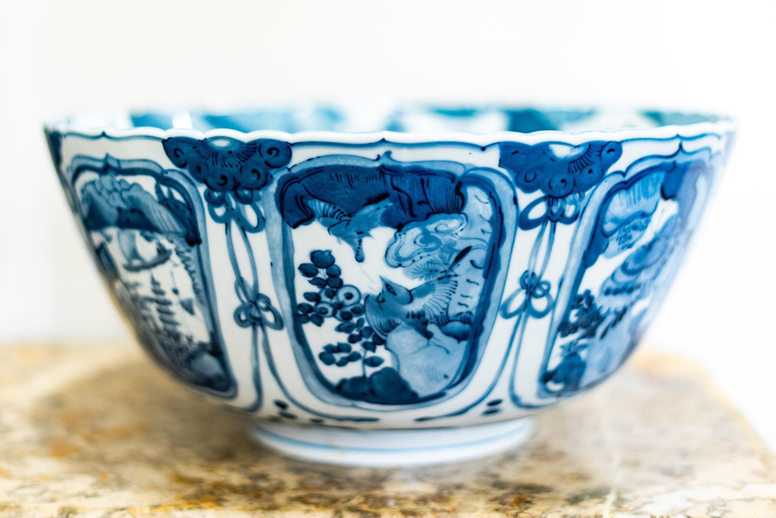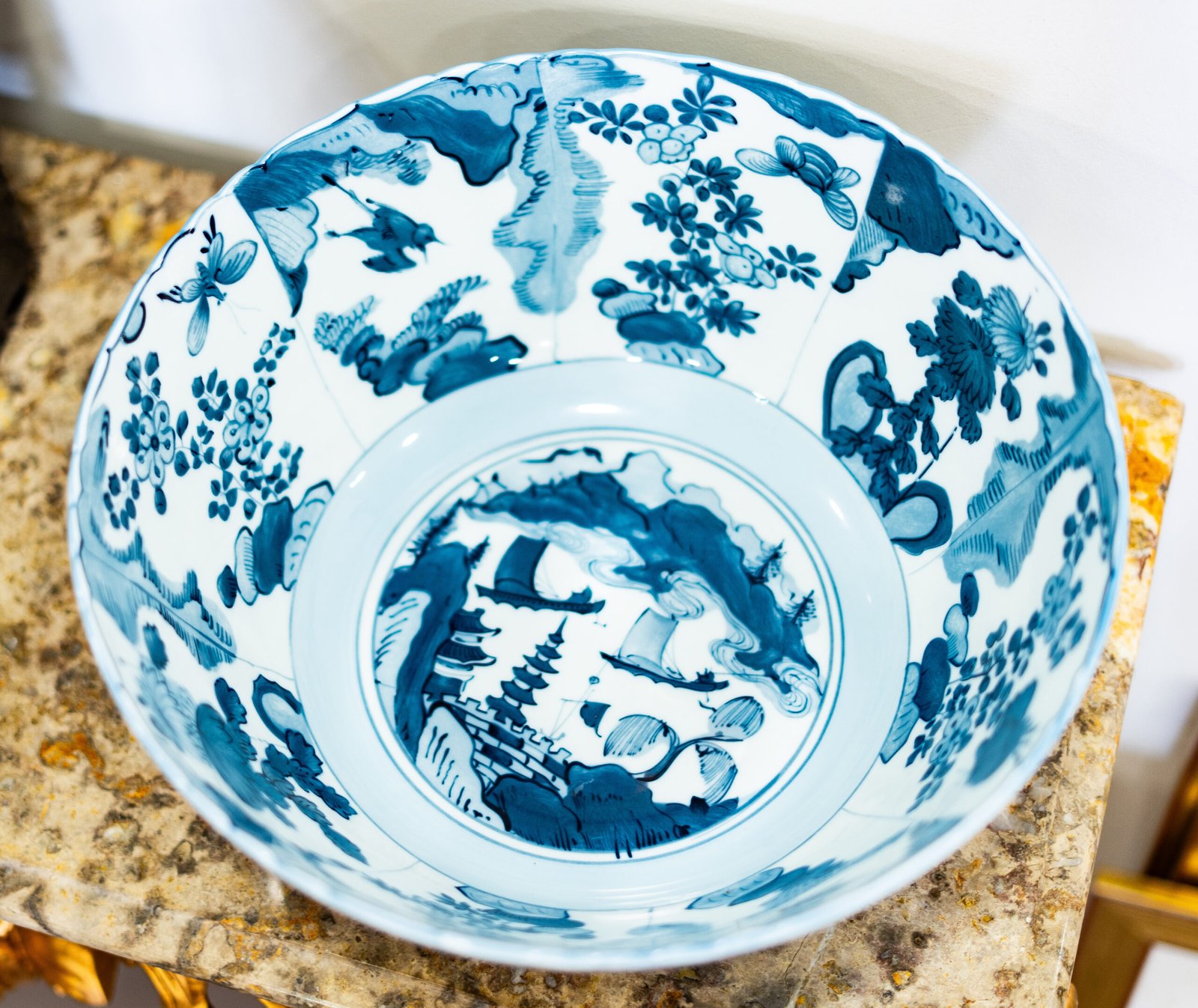 Taça de porcelana de grande porte, decorada com cenas contínuas em azul-cobalto sobre fundo branco vidrado. O interior exibe no centro uma paisagem oriental estilizada com árvores, pagodes, nuvens e barcos, remetendo à estética clássica chinesa exportada para a Europa nos séculos XVII e XVIII.