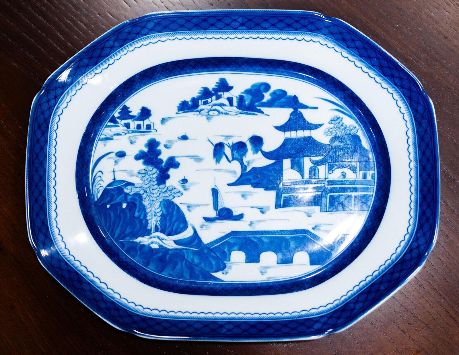 Travessa octogonal em porcelana de pasta branca, com decoração azul cobalto no clássico estilo “Willow Pattern” (Padrão do Salgueiro). A superfície central exibe uma cena oriental idílica com pagodes, ponte arqueada, barco à vela e vegetação exótica, evocando os motivos românticos da lenda chinesa que inspirou este padrão europeu.
