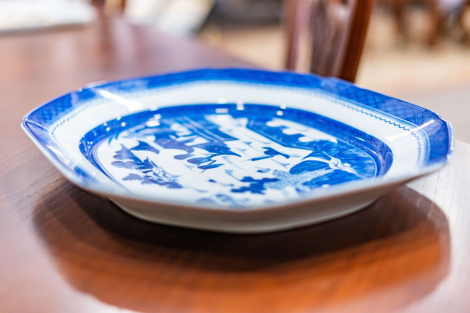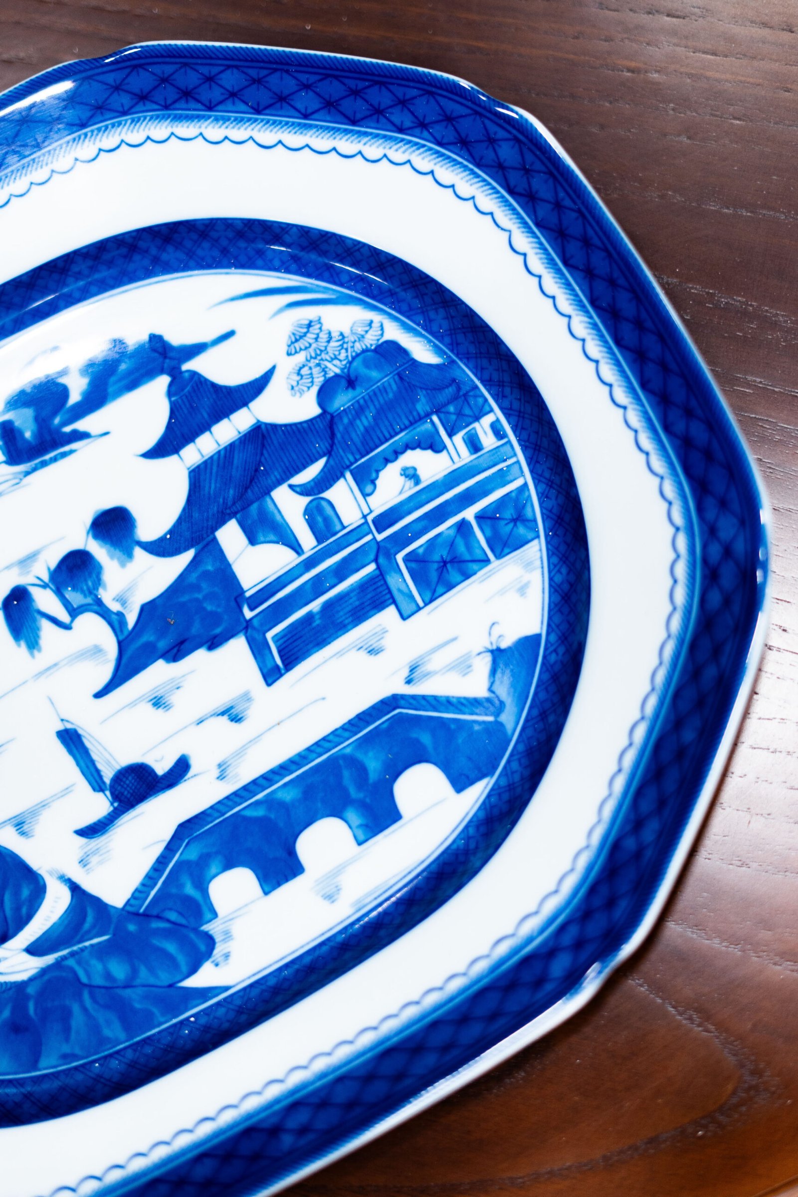 Travessa Octogonal de Porcelana – Estilo “Willow Pattern” Azul e Branco